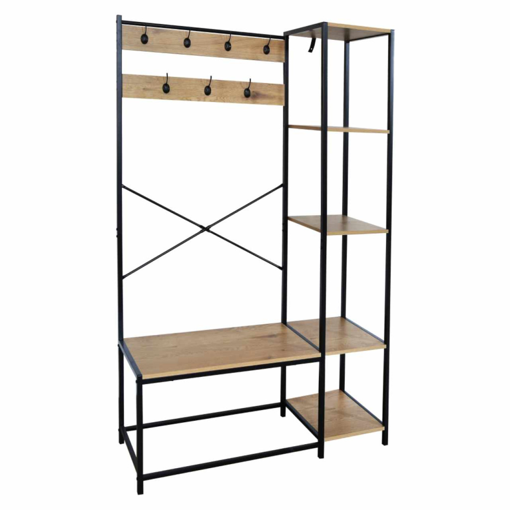 Anyag: fém/laminált MDFSzín: fekete/tölgyMéretek (SzxMéxMa): 110x40x180 cmAnyagvastagság MDF: 1,5 cmA polc alsó részének magassága a talajtól: 5 cmHét kampóKampó teherbírása: 4 kgÖt polcKis polc teherbírása: 10 kgNagy polc teherbírása: 10 kgIpari stílusEgyszerűPraktikusNem alkalmas ülésreAjánlott a falhoz rögzíteniSzétszerelve szállítva