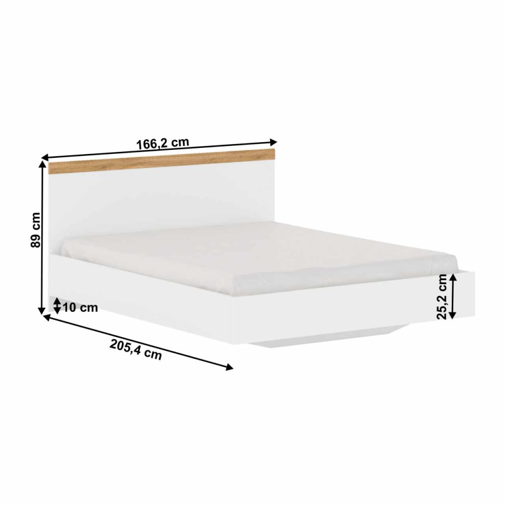 Anyag: laminált DTD/ABS élek Szín: fehér/wotan tölgy Méretek (SzxMéxMa): 166,2x205,4x89 cm Alvó felület (SzxHo): 160x200 cm Teherbírás/egy ágy: 120 kg Ajánlott matrac magasság : min 9cm Anyag vastagsága: 1,6 - 2,2 cm Az alsó tér magassága a padlótól: 10 cm Oldalfal magassága: 25,2 cm Tárhely nélkül Matrac és ágyrács nélkül szállítjuk Matrac és ágyrács vásárolható hozzá a kínálatunkból Bontásban szállítva