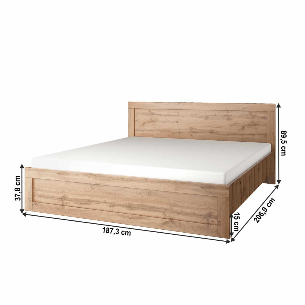 Franciaágy MORATIZ 180 Anyag: laminált DTD Szín: wotan tölgy Méretek (SzxMéxMa): 187,3x206,9x89,5 cm Anyag vastagsága: 1,6 - 2,2 cm Ajánlott minimális matracmagasság: 10 cm Magasság a padlótól: 15 cm Teherbírás/személy: 100 kg Tárhely nélkül Ágyráccsal Fém kerettel és lamellás ráccsal szállítjukMatrac nélkül szállítvaMatrac hozzávásárolható a kínálatunkbólSzétszerelt állapotban szállítva