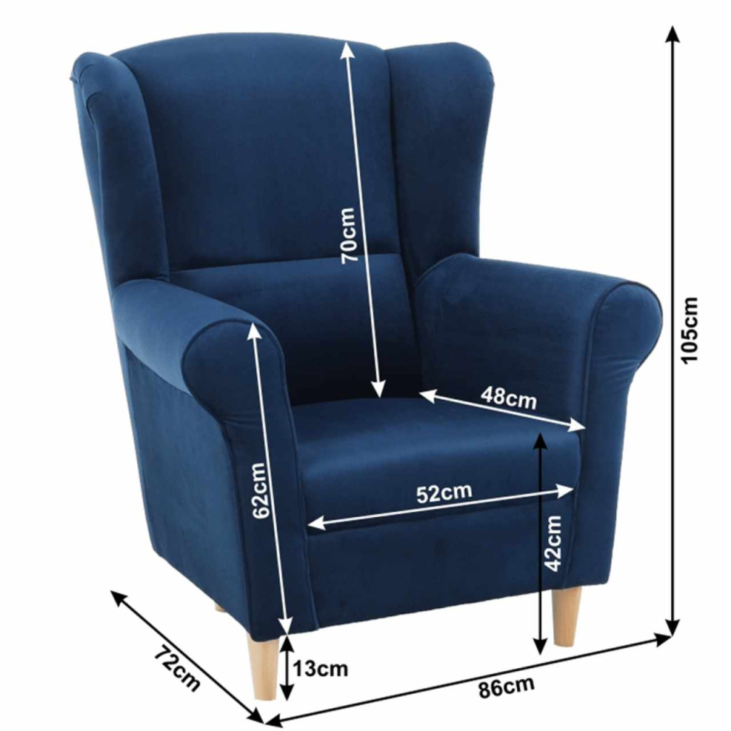 Fotel-füles CHARLOT riviera kék 81 szövetben. Fa lábak. A szövet kopásállósága: 90 000 Martindale Méretek (SzéxMéxMa): 86x82x105 cm Háttámla magassága: 70 cm Kartámla magassága: 62 cm Szállítás szétszerelve. Megrendelhető Charlot Alova szövet színváltozataiban ára 143 900 Ft vagy Soro szövetből ára 147 500 Ft, Coral szövet színváltozataiban ára 154 500 Ft. Egyedi megrendelés esetén szükség van az adott összegnek a 20%-át befizetni mint előleg. Az előleg befizetése után az Ön követelményét benyújtjuk a gyártónak. Szállítási idő 8-10 hét.
