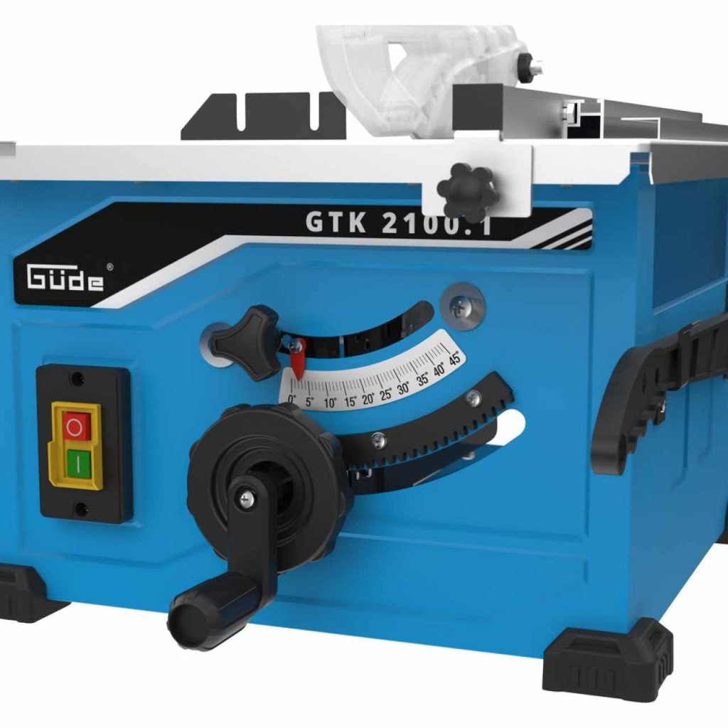 Güde GTK 2100.1 asztali fűrészgép 90-45° között változtatható vágási szöggel.- Toló rúd- Vágó korlát- Fűrészlapvédő- Csatlakozás az elszívó rendszerhez- Fűrészlap magasságának beállítása kurblival- Csúszásmentes gumilábak- Nulla feszültségű kapcsoló- Porszórt acéllemezből készült asztal- 1 HM fűrészlapOpcionális tartozékok:- #55075 Fűrészlap HM 210x30x40Z- #55076 Fűrészlap HM 210x30x60Z