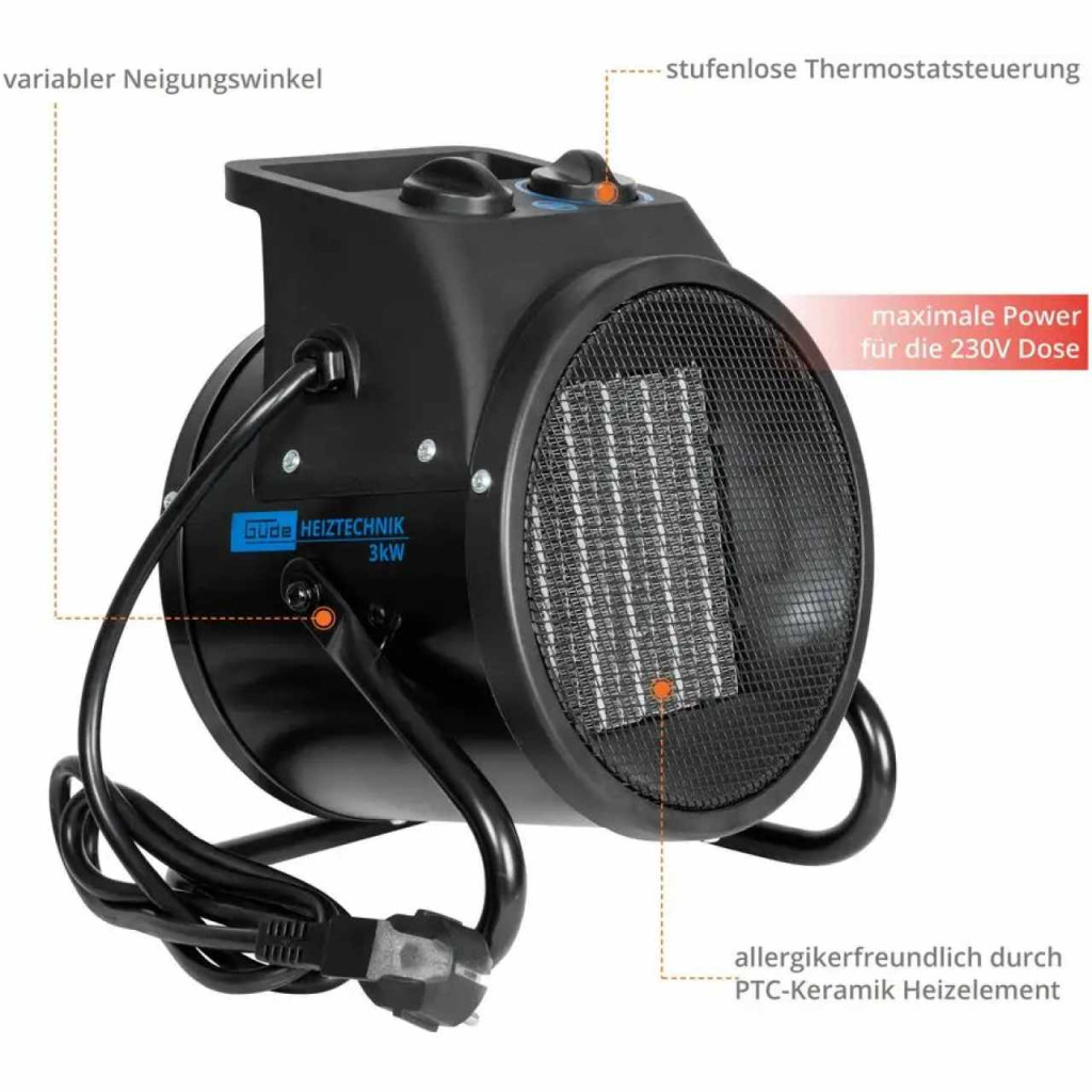 A GEH 3000 P a maximális teljesítmény a 230 V-os aljzathoz. Ez a forrólevegős melegítő gyorsan felmelegíti a szobahőmérsékletet. Jellemző rá a könnyű kezelhetőséget és mobilitás. Kiváló minőségű PTC fűtőelem (kerámia).