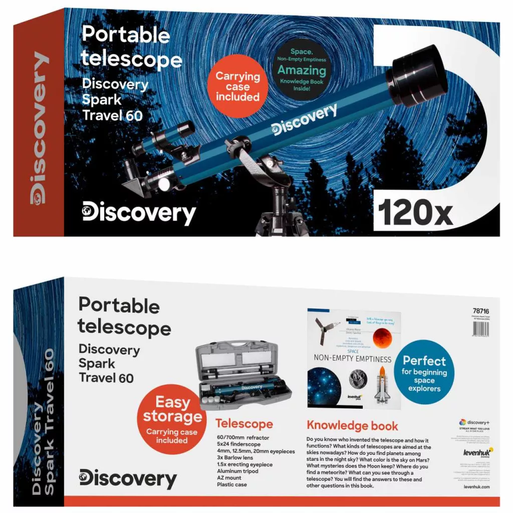 A Discovery Spark Travel 60 teleszkóp bármelyik lelkes kezdő csillagászt lenyűgözi. A refraktort színes ajándékdobozban adjuk, amiben a teleszkóp mellett Ön az összes szükséges tartozékot is megtalálja, például a háromlábú állványt, a hordozótokot és a „Világűr. A nem üres üresség” című ismeretterjesztő könyvet. Ez a színes képekkel illusztrált enciklopédia számos érdekes ténnyel és adattal nyújt betekintést az éjszakai égbolt világába, így Ön a megfigyeléseket kellő elméleti tudással a háta mögött végezheti el.