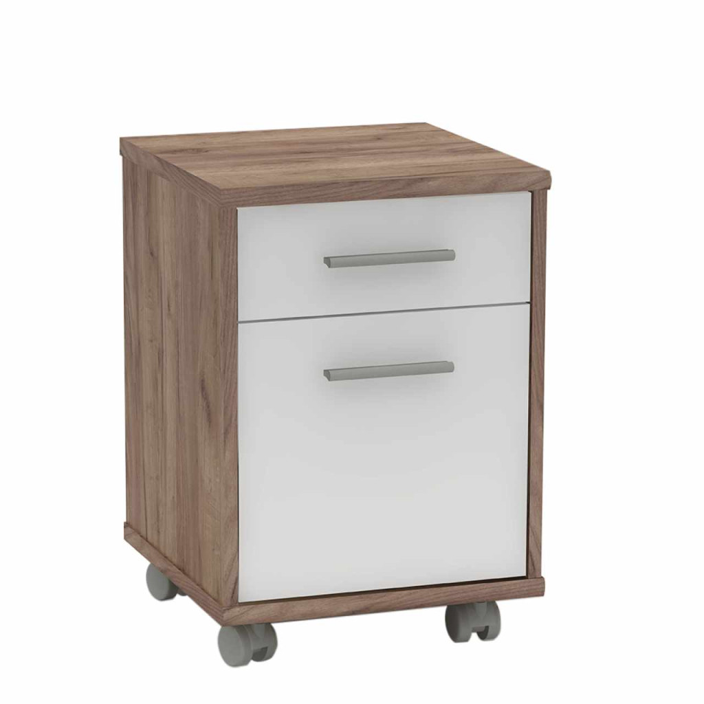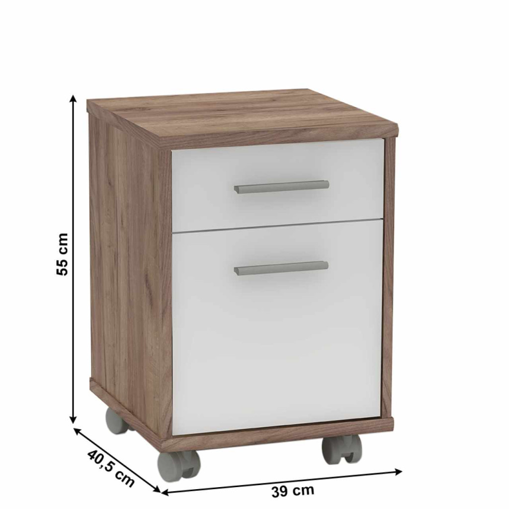 Irodai konténer JOHAN 2 NEW 07egy fiókkal, és szekrénnyel Színkivitel: kraft dunkel/fehér Anyag: laminált DTD Méretek (SzéxMéxMa): 39x40,5x55 cm Fiók méretek (SzéxMéxMa): 34,8x35x12,5 cm Szekrény méretek(SzéxMéxMa): 35,2x38x34,8 cm Négy kerék Szlovák termék ABS élek Bontásban szállítva