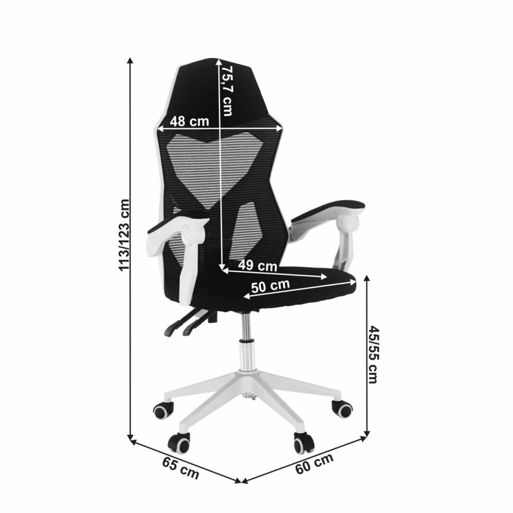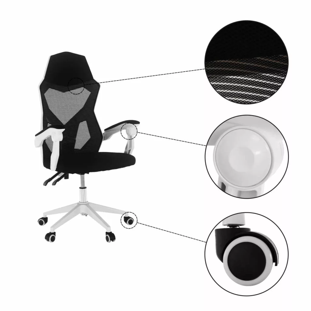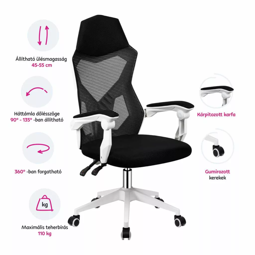 Anyag: háló/műanyag/fa Szövet kopásállósága a Martindale-teszt szerint: 90 000 ciklus Szín: fekete/fehér Méretek (SzéxMéxMa): 60x65x113-123 cm Beállítható ülésmagasság: 45-55 cm Ülés mélysége: 49 cm Ülés szélessége: 50 cm Háttámla magassága: 75,7 cm Háttámla szélessége: 48 cm Maximális teherbírás: 110 kg Gamer A háttámla dőlésének beállítása 90° - 135° Forgatható Fejtámlával Kartámlával Hintamechanika Talpazat anyaga Ülés fa szerkezete Univerzális kerekek puha és kemény padlókhoz egyarántBontásban szállítva