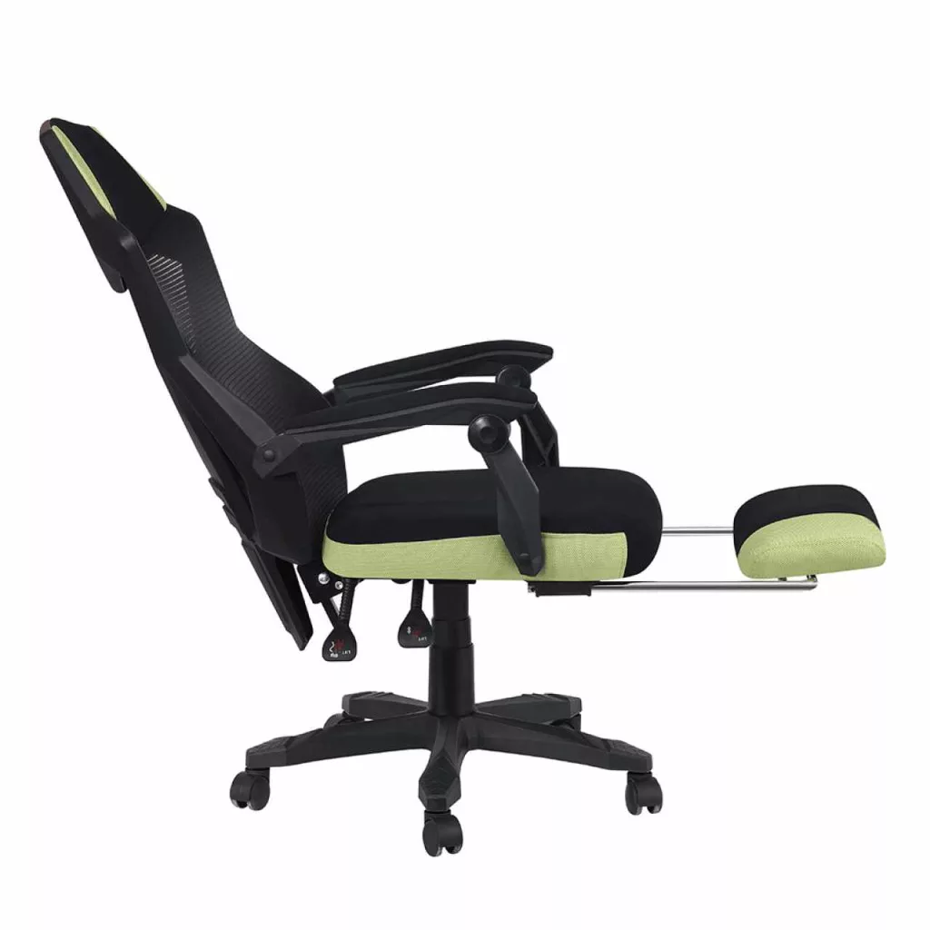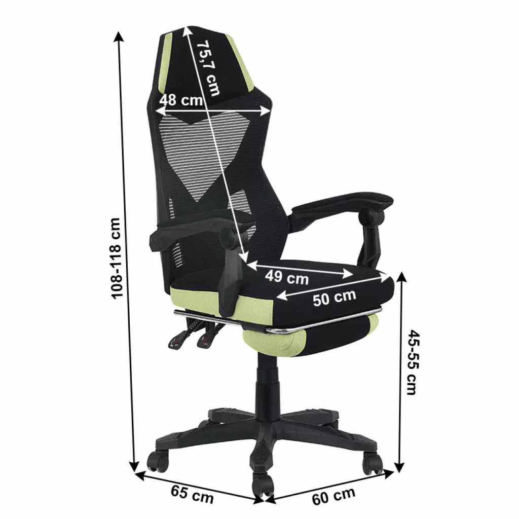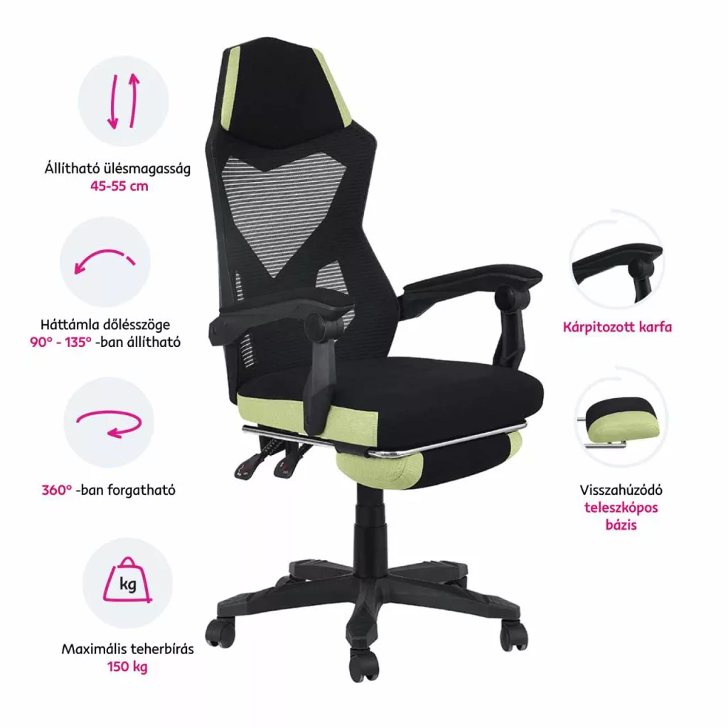 Szerkezet anyaga: műanyag Szín: fekete Kárpitozás anyaga: háló A háló kopásállósága a Martindale teszt szerint: 90 000 ciklus Szín: fekete/zöld Méretek (SzxMéxMa): 60x65x108-118 cm Állítható ülésmagasság: 45-55 cm Ülés mélysége: 49 cm Ülés szélessége: 50 cm Háttámla magassága: 75,7 cm Háttámla szélessége: 48 cm Maximális teherbírás: 150 kg A pozicionálható háttámla dőlésszöge 90-135° Hosszú ülésre van tervezve Kárpitozott kéztámlák Fa tartó keret az ülésen Műanyag tartó keret a háttámlán Műanyag alap Kihúzható lábtartó Bontásban szállítva