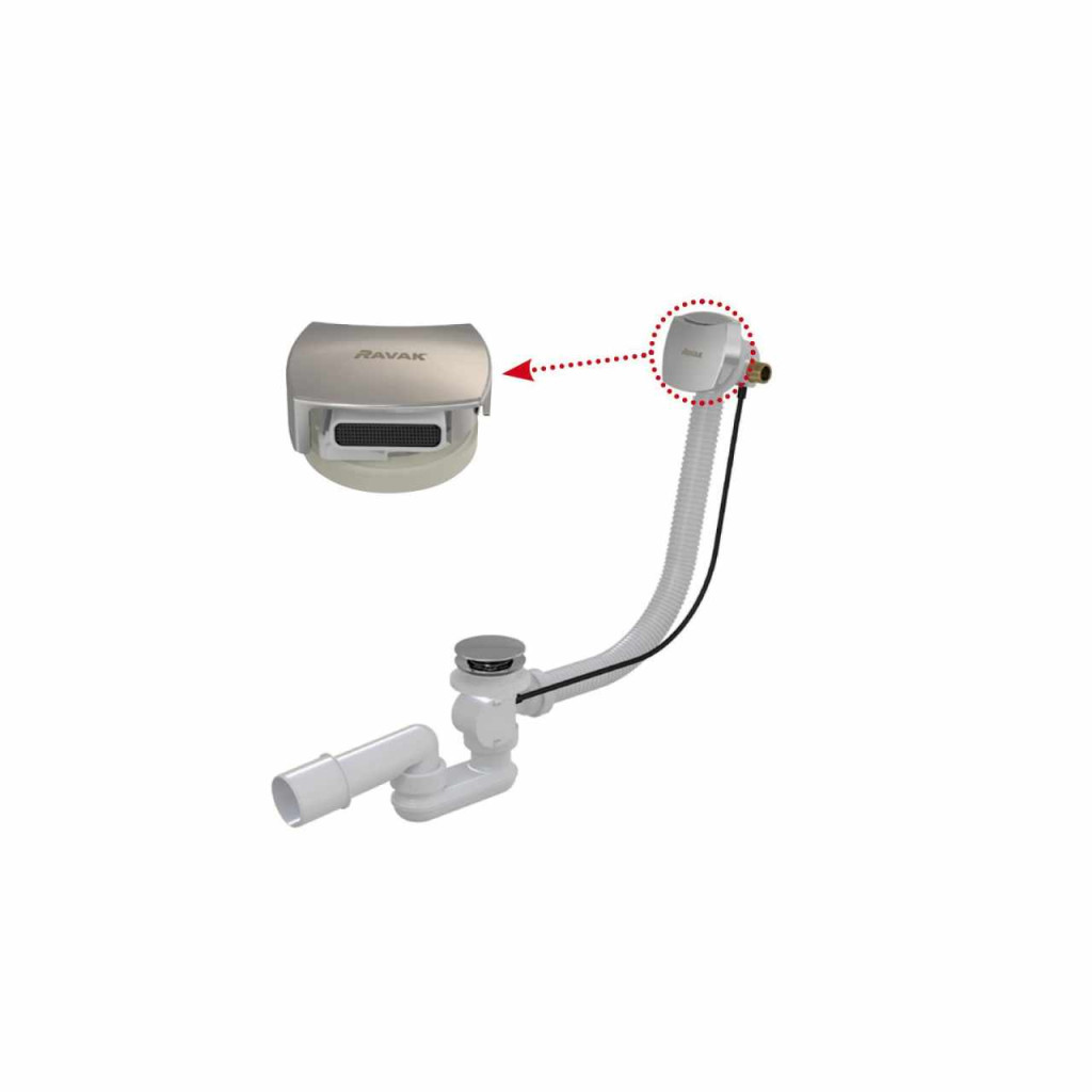 A kád átfolyó készletek túlfolyóval történő feltöltése 800 mm hosszúságban, bowden kerékkel történő leeresztő vezérléssel. A termék tartalmazza a szifont (szagzáró), a fém szifon dugót és a műanyag feltöltő fejet. A leeresztő vezérlése négyzet alakú, fényes króm felületkezeléssel.