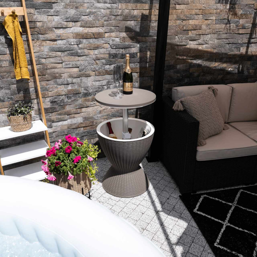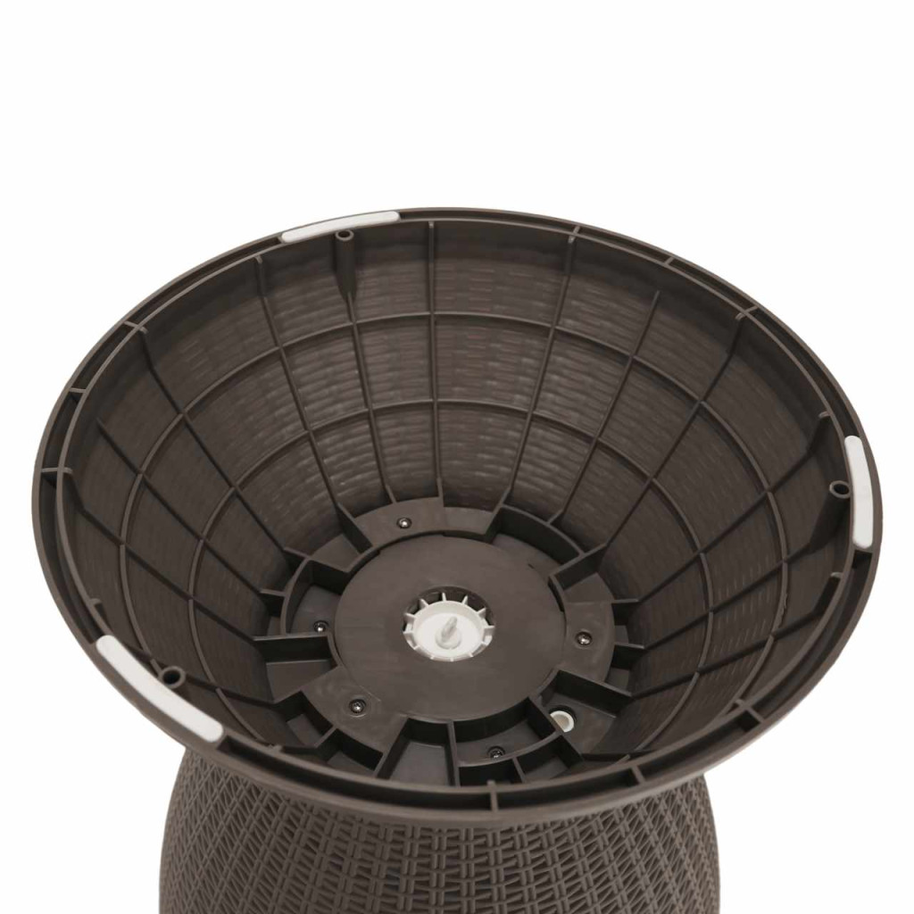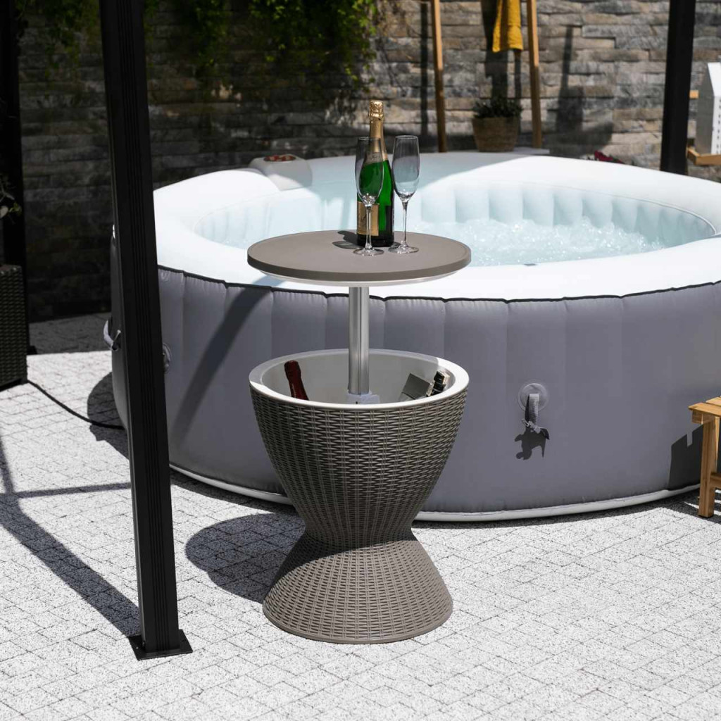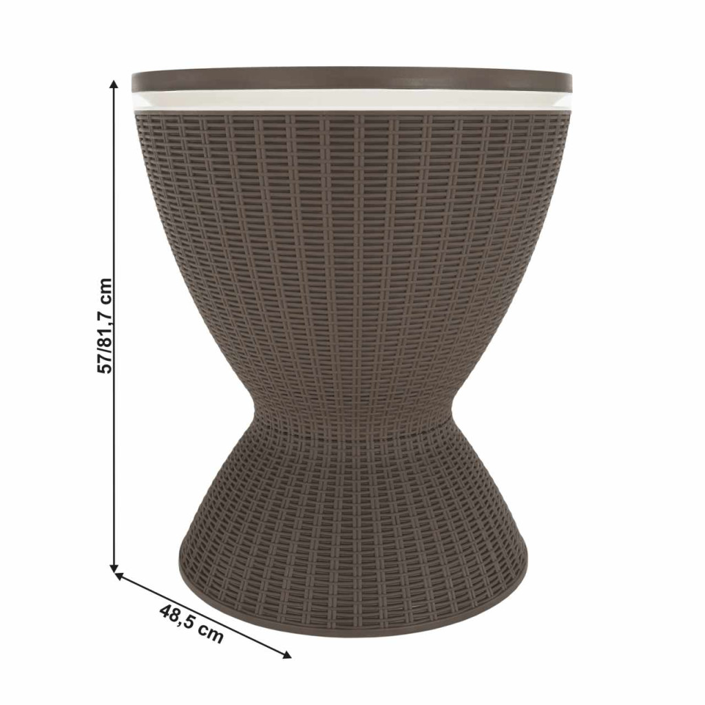 Anyag: műanyag (polipropilén) Szín: szürke Méretek (átmérőxMa): 48,5x57/81,7 cm Rattan megjelenés Kerti hűtőasztal Állítható magasság Asztal magassága a deszkával: 57 cm Asztal magassága a megemelt deszkával: 81,7 cm Kisasztalként és konferencia asztalként is használhatól Hűtőpultként is használható Jéghűtéses Az italokat mindig megfelelően hűti Minőségi anyag Hosszú ideig megőrzi színeit és frissnek tűnik Könnyű karbantartás Ellenállás az időjárási körülményekkel szemben Egyszerű összeszerelés Többfunkciós "Cool bar"-nak si nevezik Szétszerelve szállítjuk