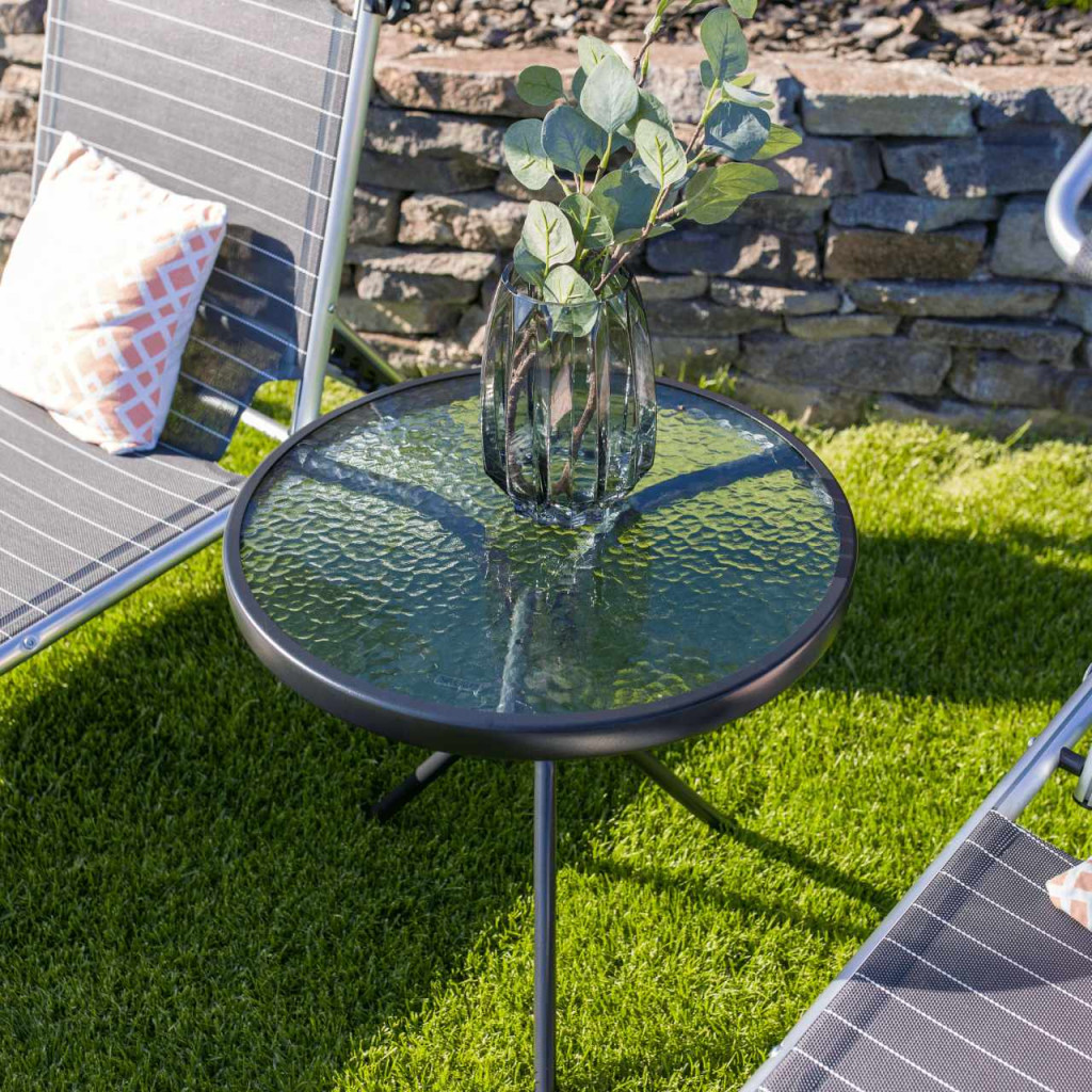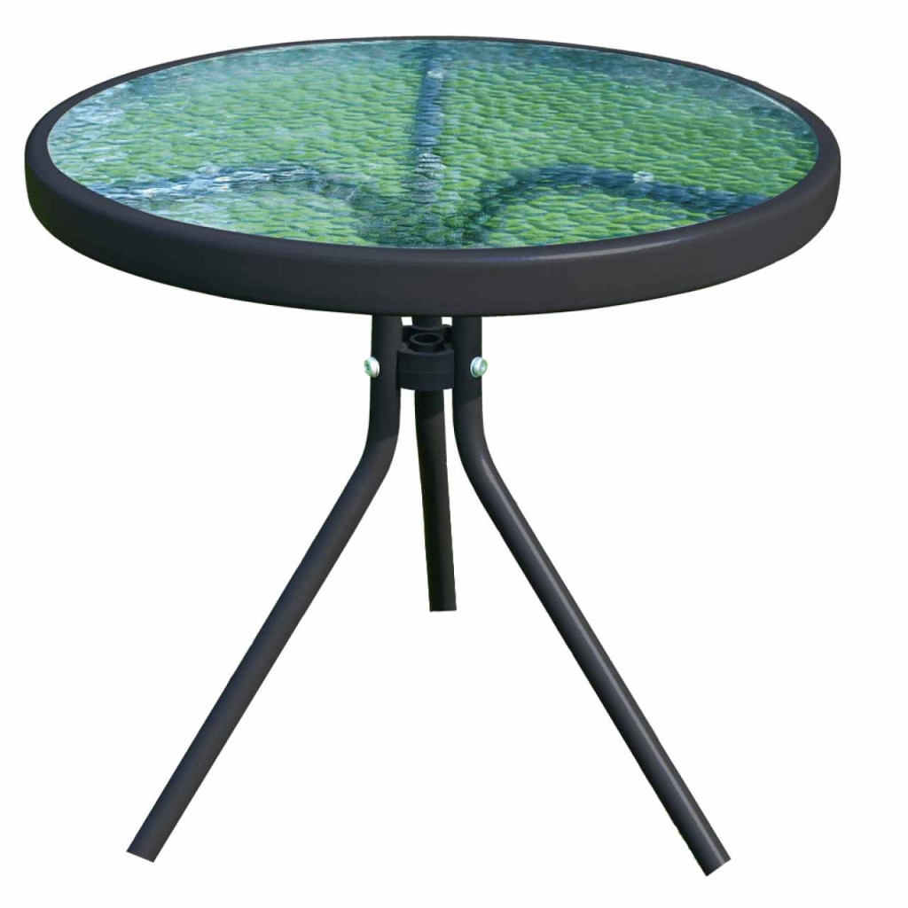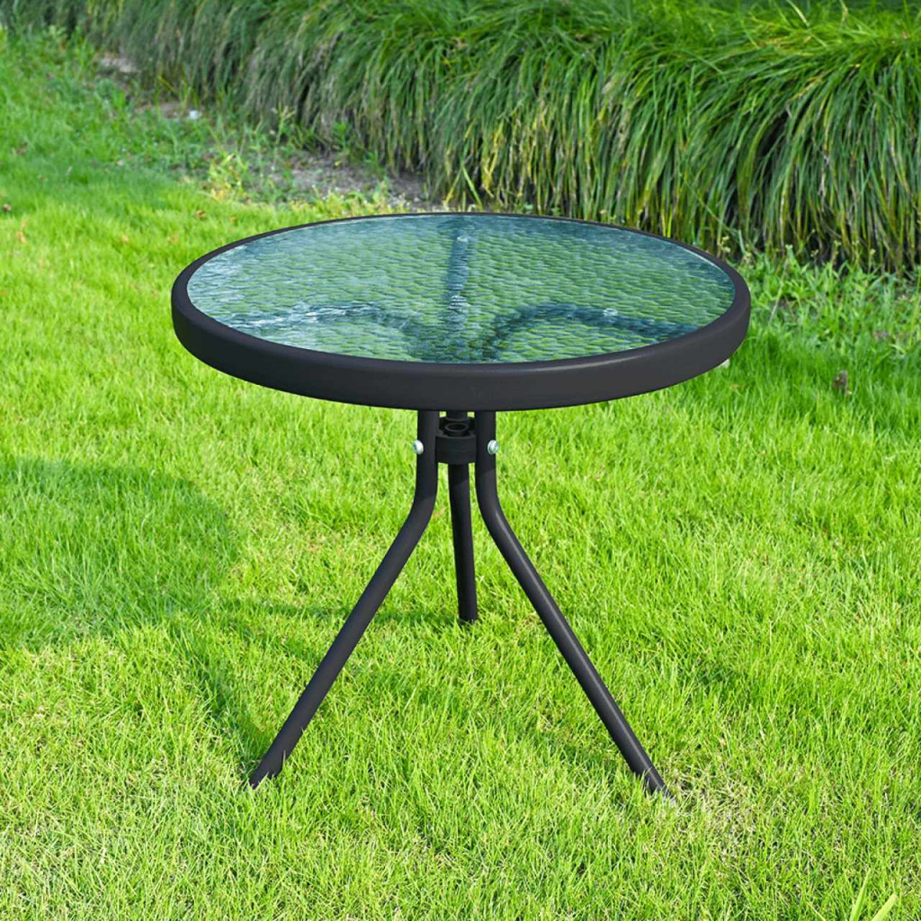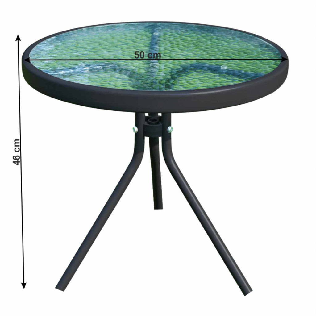 Kisasztal, amely alkalmas a kerti készlethez Anyag: edzett üveg/acélSzín: átlátszó/feketeMéretek (átmérőxMa): 50x46 cmAcél szerkezetEdzett üvegA stabilitást a három láb biztosítjaModern stílusKertiAlkalmas teraszra, kertbeSzétszerelve szállítjuk