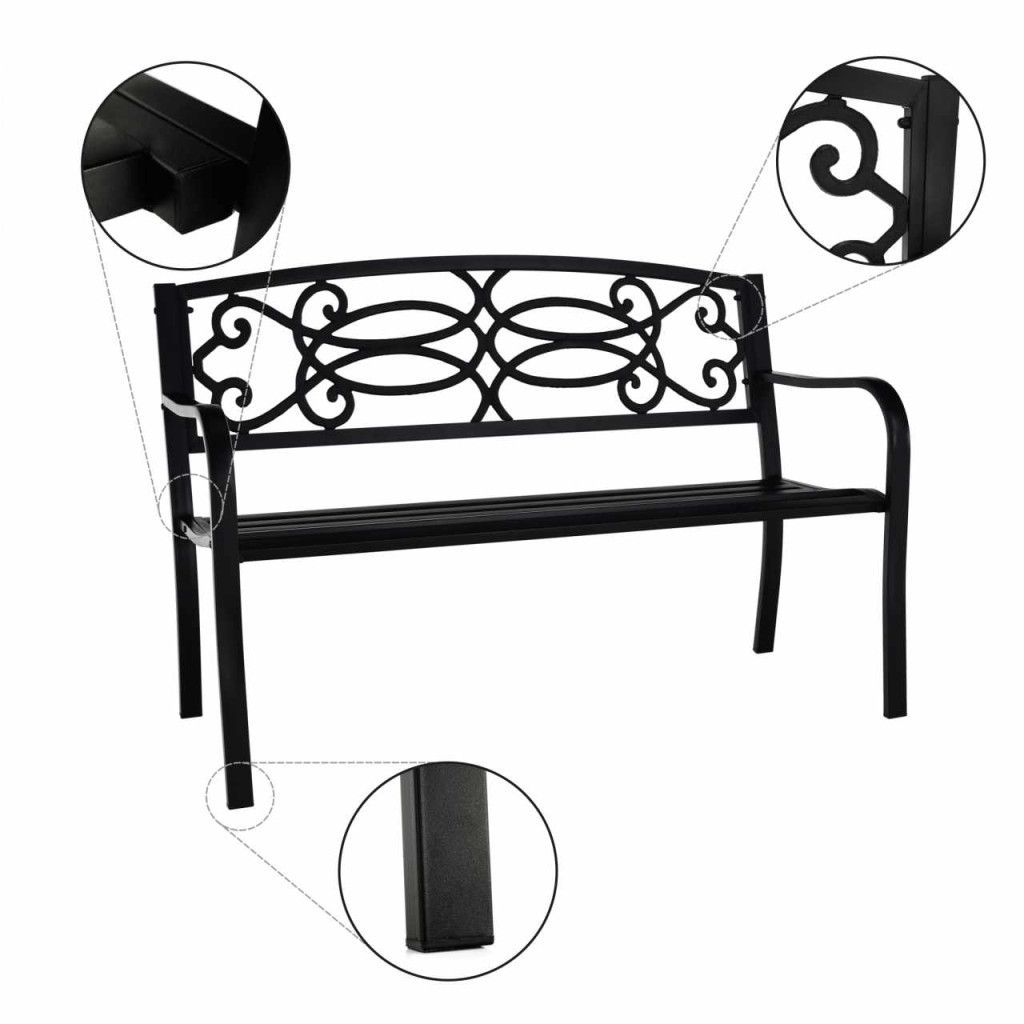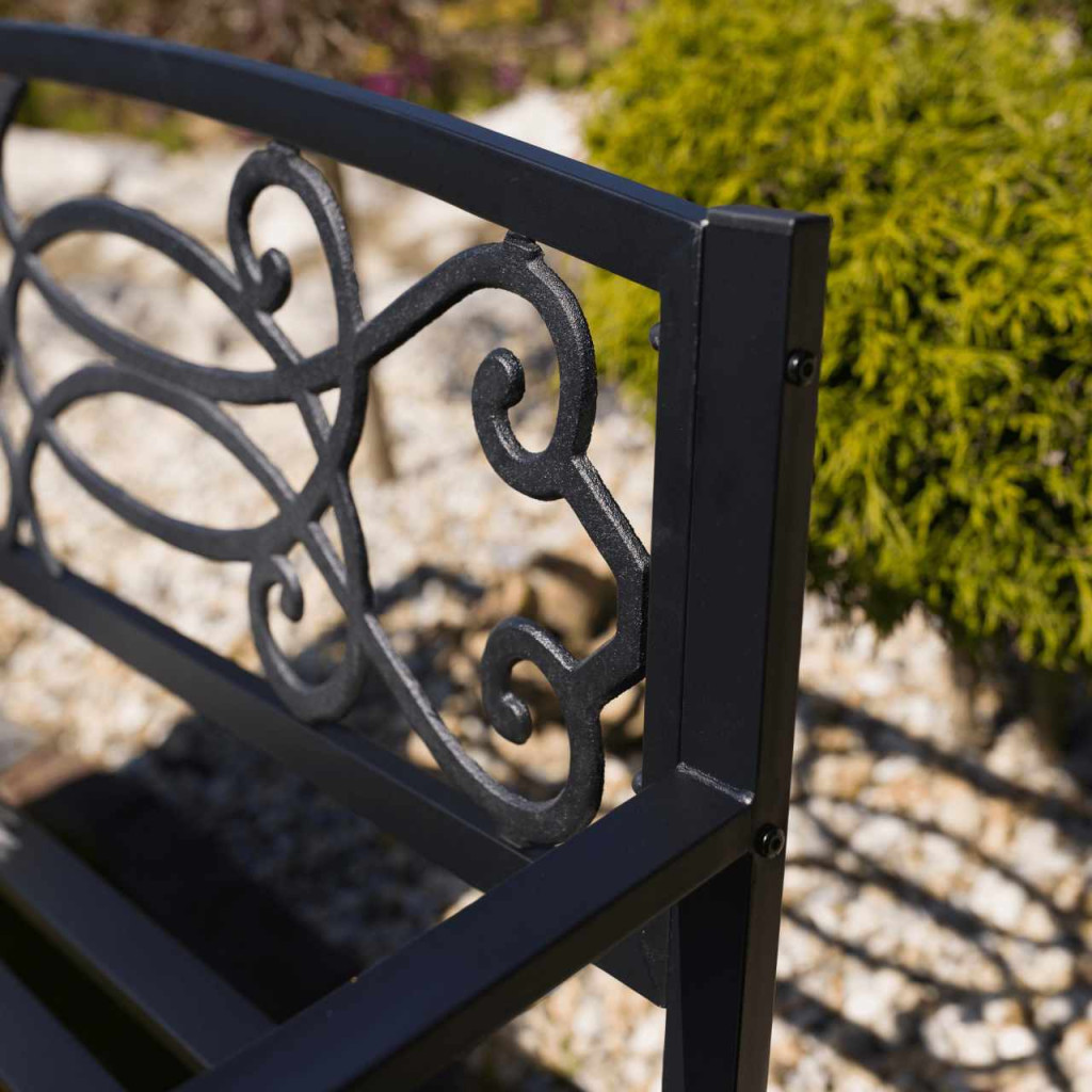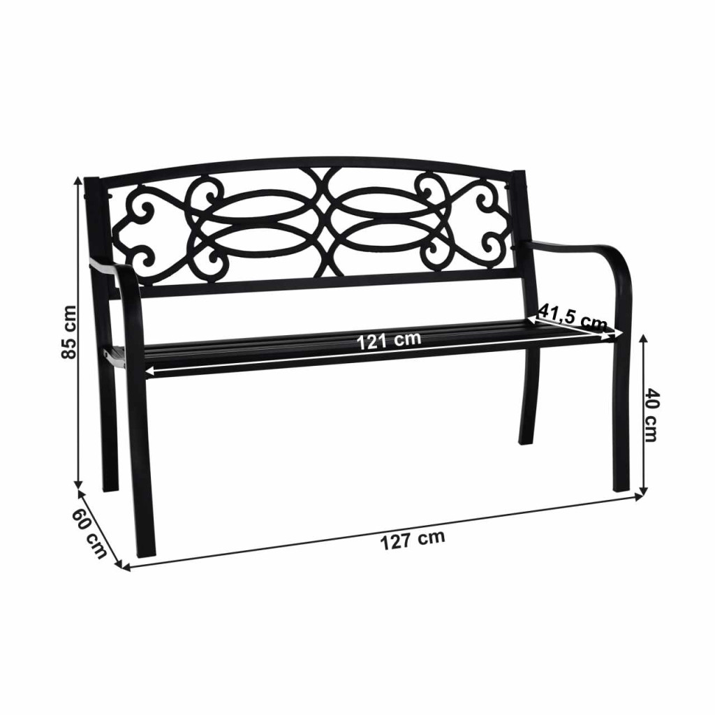 Anyag: acél Szín: fekete Méretek (SzxMéxMa): 127x60x85 cm Ülés szélessége: 121 cm Ülésmagasság: 40 cm Ülésmélység: 41,5 cm Teherbírás: 170 kg Romantikus megjelenés Díszítőelemekkel Szétszerelve szállítjuk