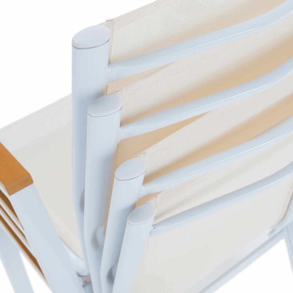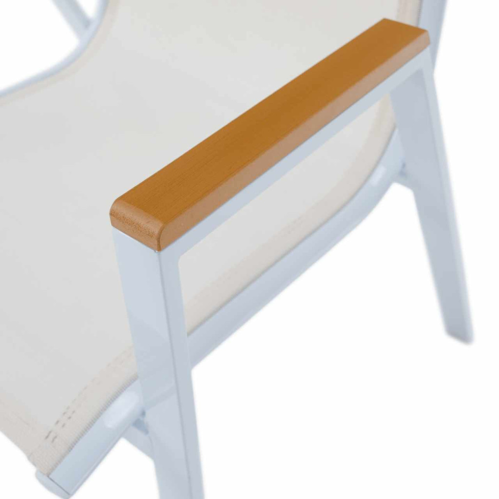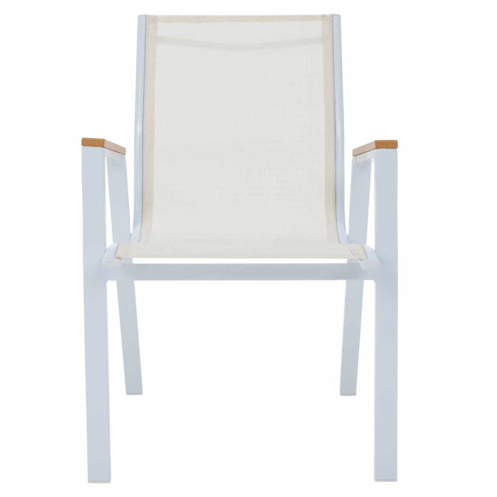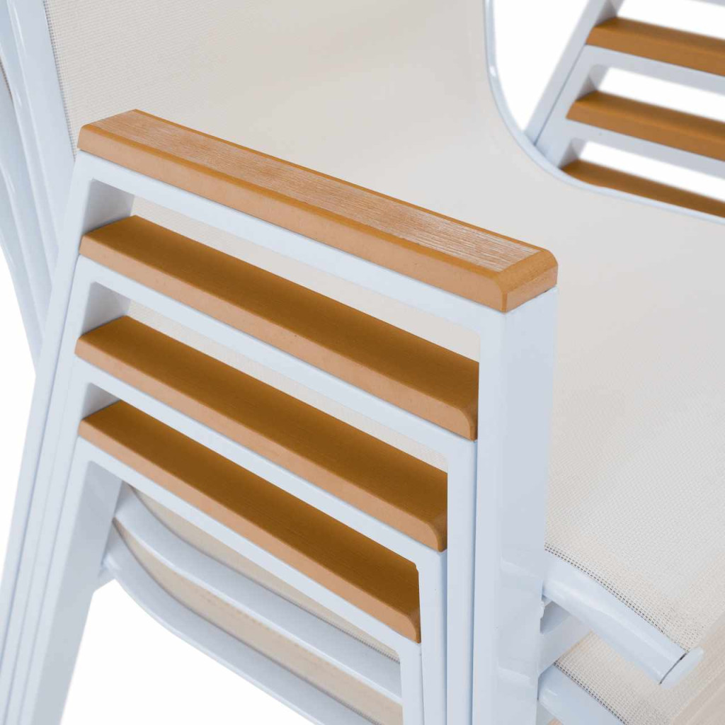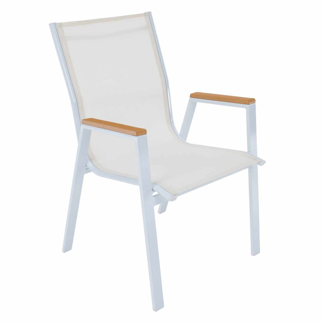 Anyag: acél/műszövet/polywoodSzín: fehér/tölgyMéretek (SzxMéxMa): 61x56x90 cmÜlés magassága: 38,5 cmÜlés mélysége: 45 cmTeherbírás: 100 kgKertiRakásolhatóKartámlákkalEgészben szállítva