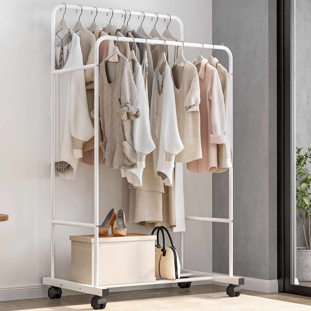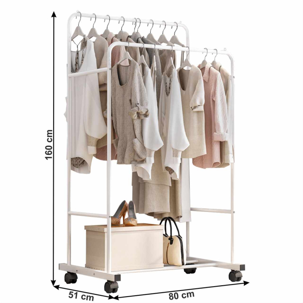 Anyag: fém Szín: fehér Méretek (SzxMéxMa): 80x51x160 cm Teherbírás: 22 kg állvány ruhákra Szilárd szerkezet Kétsoros akasztó 2 akasztórúd Polc 2 kerék fékkel Szétszerelve szállítjuk