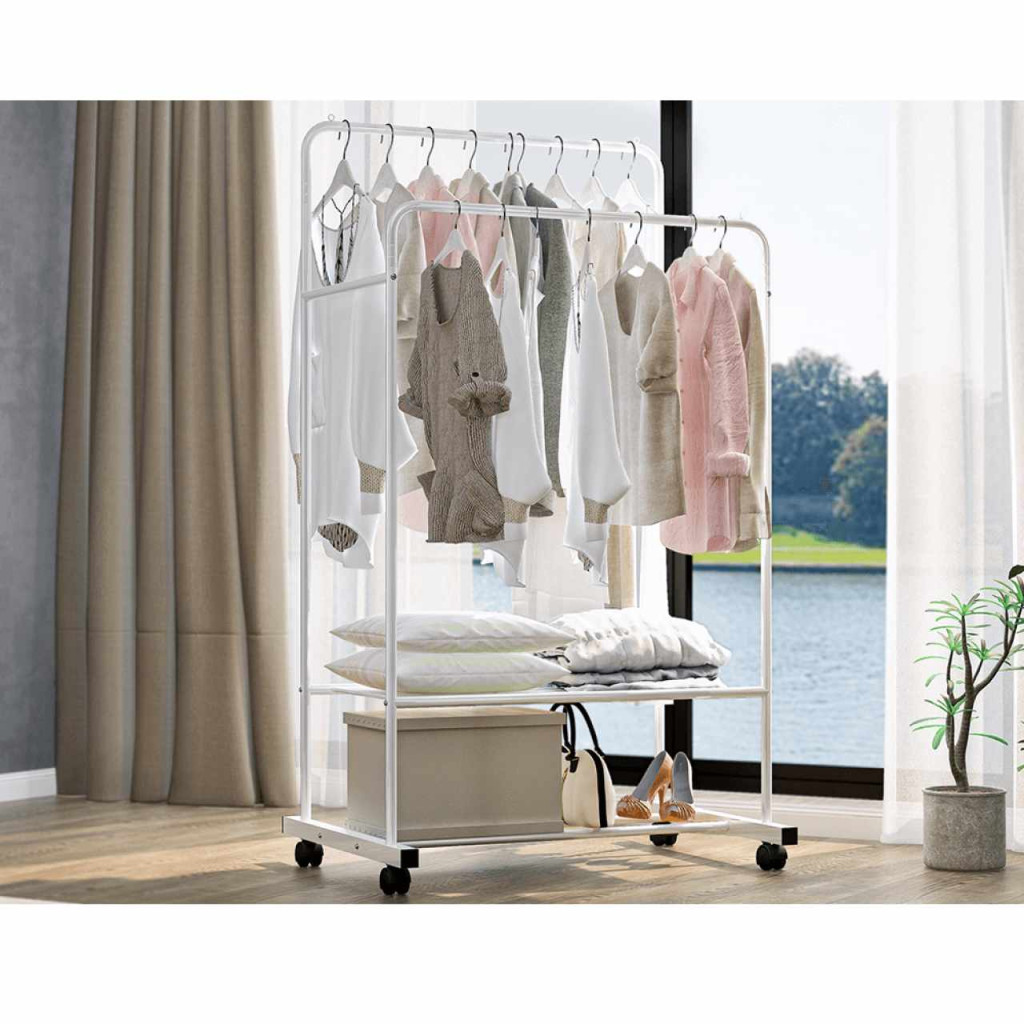 Kétsoros mozgatható akasztó, polcokkal, fehér, RAINER