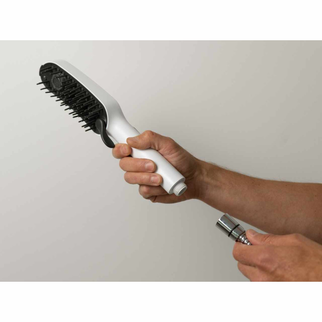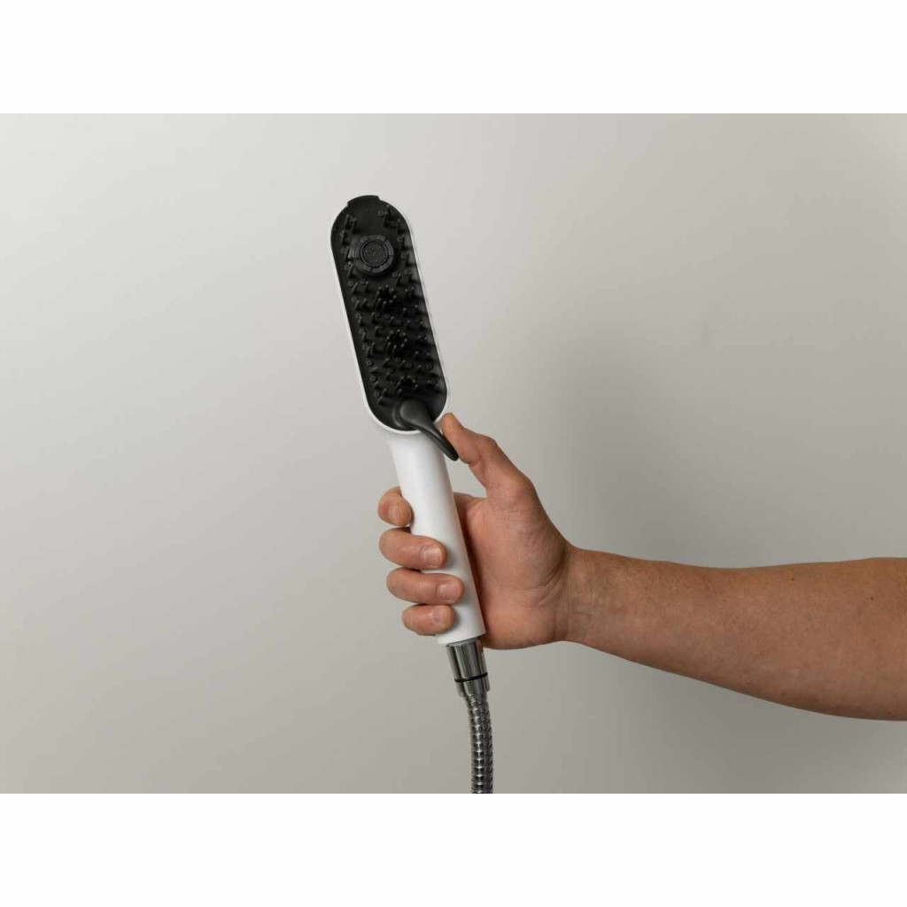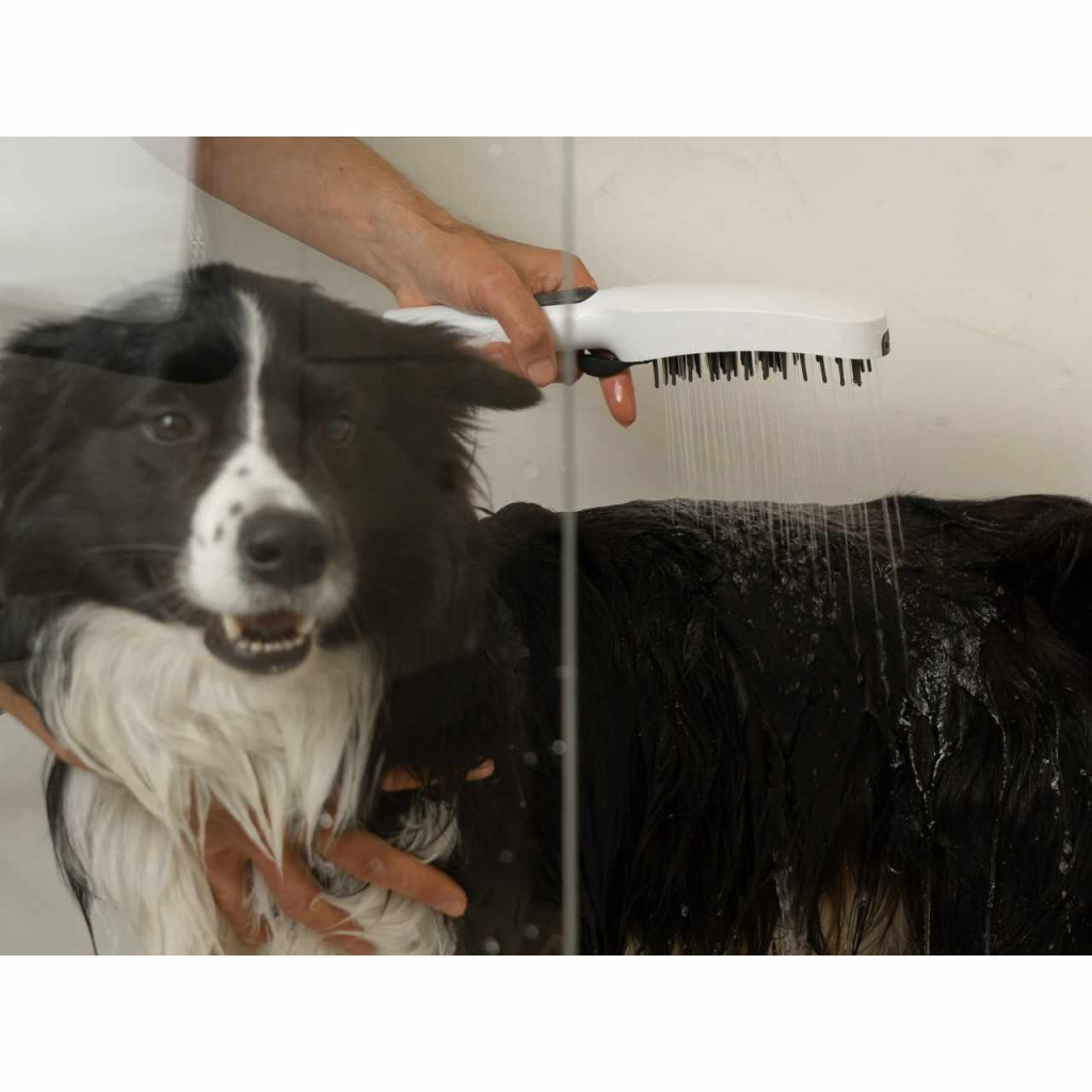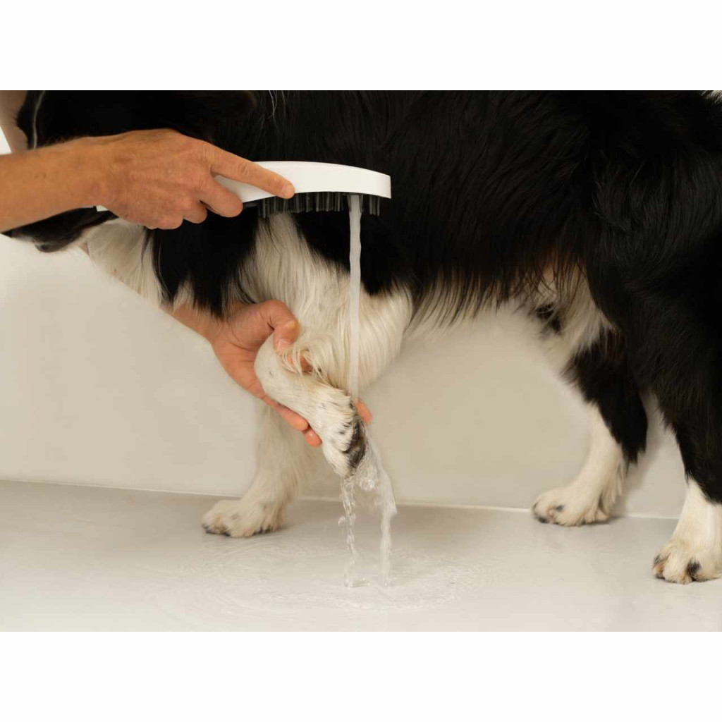 A rugalmas szilikon kefe könnyedén kifésüli a szőrzetet, felhabosítja a sampont és eltávolítja a szennyeződéseket. A kézi zuhany 4 vízsugár üzemmódot kínál, amelyeket könnyedén válthatsz forgatókarral vagy gombbal. A Rain sugár rendkívül kíméletes, különösen alkalmas a fül és a szem környékének érzékeny részeihez. A Soft sugár gyengéd, ugyanakkor elég erős a sampon felhabosításához és kiöblítéséhez. A perlátorral ellátott, levegőztetett sugár célzott és takarékos, ideális a mancsok, a has vagy az alsó testfelületek mosásához felesleges fröcskölés nélkül. Az elülső nyomó fúvóka, amelyet a hátoldalon található külön gombbal lehet vezérelni, hatékonyan eltávolítja a makacs szennyeződéseket, például a rászáradt sarat.