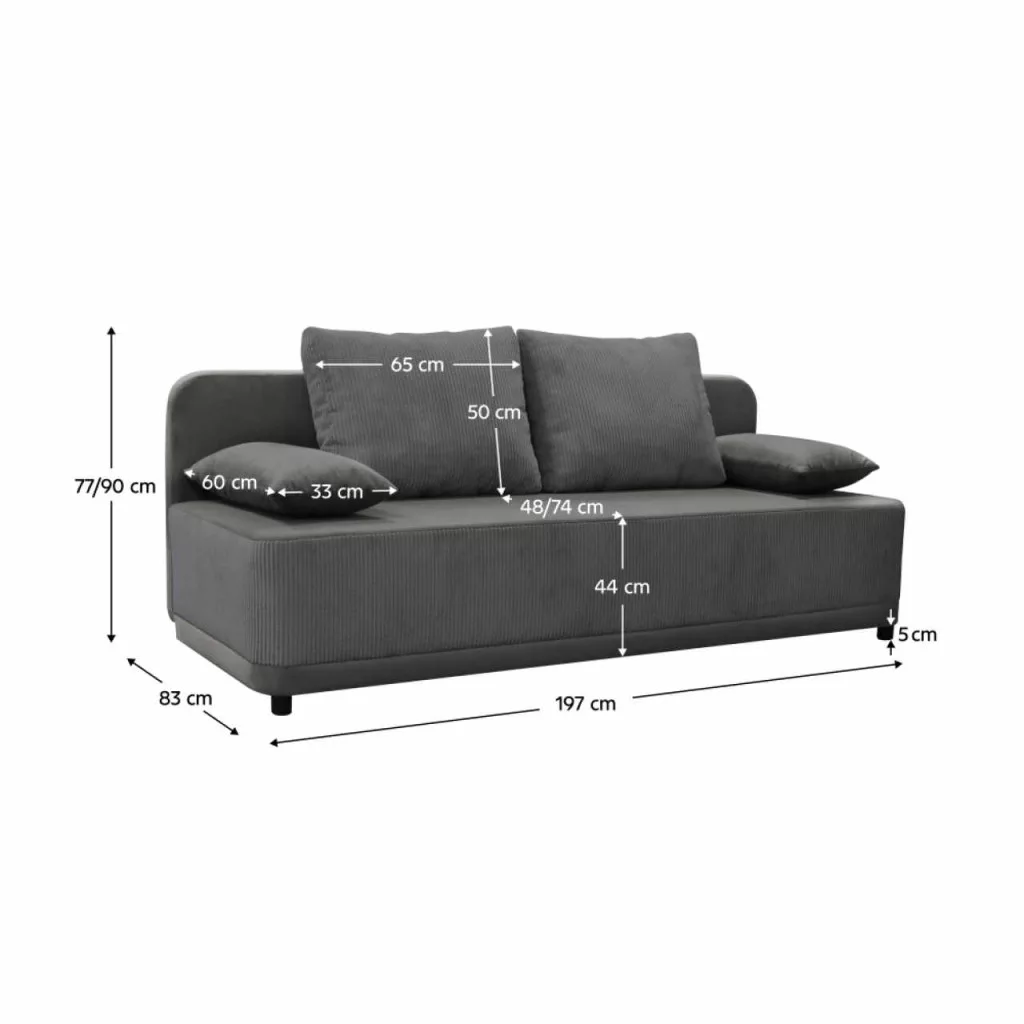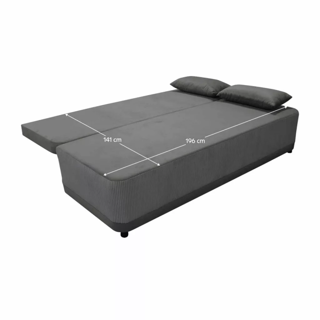 Anyag: szövet Manila 16/Poso 60A Manila szövet kopásállósága a Martindale teszt szerint: 58 000 ciklusA Poso szövet kopásállósága a Martindale teszt szerint: 90 000 ciklusSzín: szürkeMéretek (SzxMéxMa): 197x83x77/90 cmAlvófelület (SzxHo): 141x196 cmÜlés magassága: 44 cmÜlés mélysége: 48/74 cmLábak anyaga: műanyagLábak színe: feketeAz alsó tér magassága a padlótól: 5 cmTöltet: purhabTeljesen kárpitozottKihúzhatóTárhelyPárnákkal szállítvaNagy párna méretei (SzxMa): 65x50 cmKis párna méretei (SzxMé): 33x60 cmTeherbírás/személy: 90 kgPraktikusModernSzétszerelve szállítva