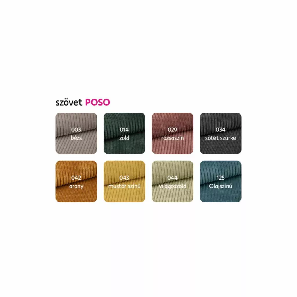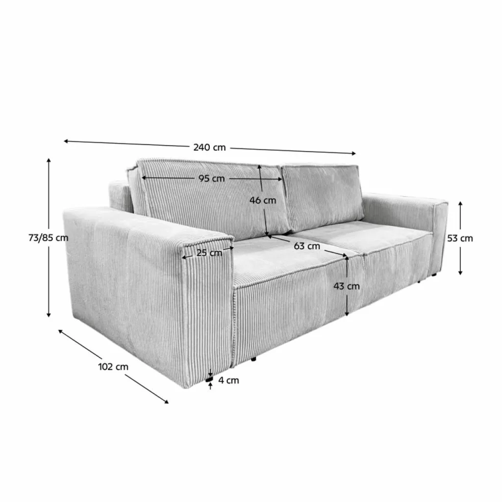 Anyag: szövet Poso 55A szövet kopásállósága a Martindale teszt szerint: 90.000 ciklusSzín: világosszürkeMéretek (SzxMéxMa): 240x102x73/85 cmÜlés magassága: 43 cmÜlés mélysége: 63 cmAlvófelület (SzxHo):150x190 cmAz alsó tér magassága a padlótól: 4 cmKartámasz magassága: 53 cmKartámasz szélessége: 25 cmMűanyag lábakLábak színe: feketeTöltet: falista rugó/purhabTeherbírás/személy: 90 kgTeljesen kárpitozottKihúzhatóTárhellyelPárnákkalNagy párnák méretei: 95x46 cmBIG SOFA kialakításPraktikusModernSzétszerelve szállítvaA Poso szövet 8 színváltoztatában megrendelhető. Egyedi megrendelés esetén az adott összeg 20%-át előlegként kell megfizetni. Az előleg megfizetése után rendelés gyártásra kerül. A szállítási idő 6-8 hét.