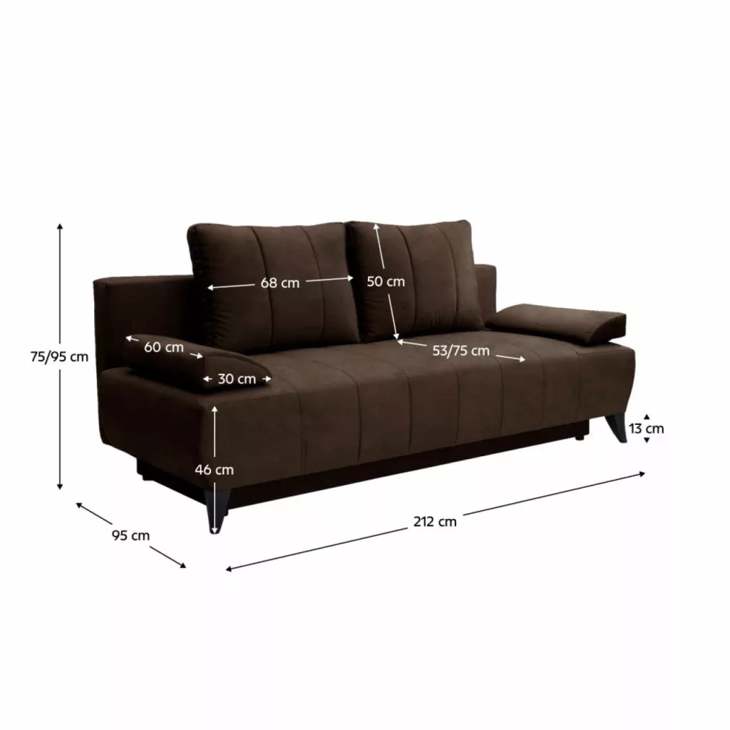 Anyag: szövet Kronos 06A szövet kopásállósága a Martindale teszt szerint: 50 000 ciklusSzín: barnaMéretek (SzxMéxMa): 212x95x75/95 cmÜlés magassága: 46 cmÜlés mélysége: 53/75 cmAlvófelület (SzxHo): 212x140 cmMűanyag lábakLábak színe: feketeAz alsó tér magassága a padlótól: 13 cmTöltet: bonellrugó/poliuretán habTeljesen kárpitozottKihúzhatóTárhellyel2 nagy és 2 kis párnaNagy párnák mérete (SzxMa): 50x68 cmKis párnák mérete (SzxMa): 60x30 cmTeherbírás/személy: 90 kgPraktikusModernDekoratív steppelésSzétszerelve szállítva