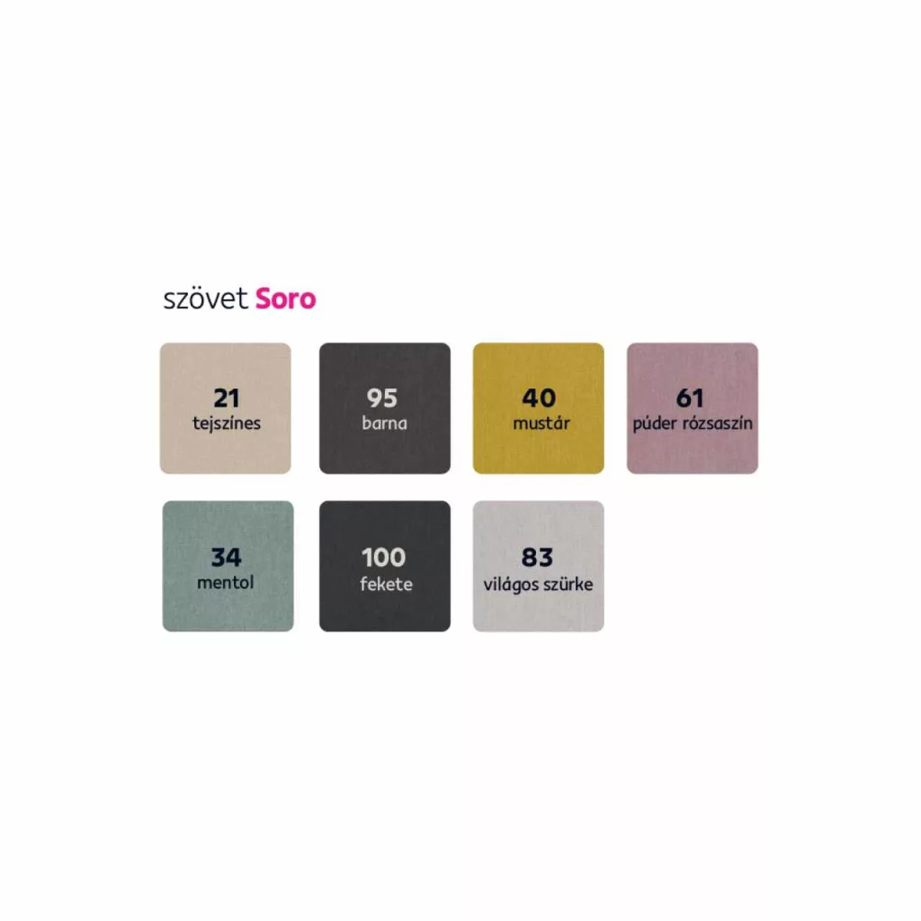 Anyag: szövet Soro 23/28A szövet kopásállósága a Martindale teszt szerint: 90 000 ciklusSzín: szürkésbarna Taupe/barnaMéretek (SzxMéxMa): 200x95x100 cmÜlés magassága: 45 cmÜlés mélysége: 57 cmAlvófelület (SzxHo): 122x200 cmMűanyag lábakAz alsó tér magassága a padlótól: 2 cmTöltet: bonell rugó/pur habKinyithatóTeherbírás/személy: 90 kgPraktikusModernKlasszikus stílusKét díszpárnával szállítjukSzétszerelve szállítvaA Soro szövet 7 színváltozatában rendelhető ár kanapé - 211 500 Ft, fotel - 106 500 Ft, illetve a fa színváltozata is választható dió vagy tölgy színben. Egyedi megrendelés esetén az összeg 20%-át előlegként szükséges befizetni. Az előleg befizetése után a megrendelése gyártásba kerül. A szállítási idő 6-8 hét.