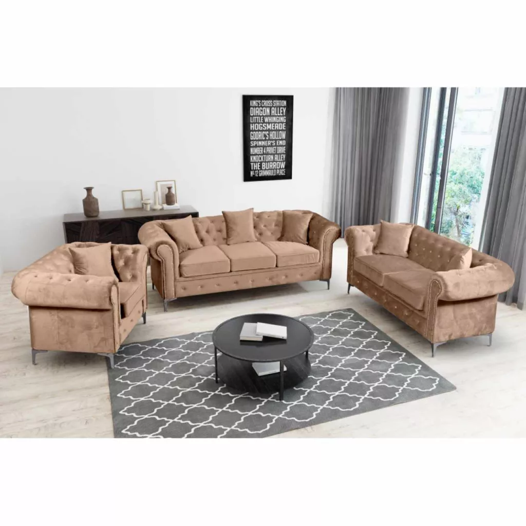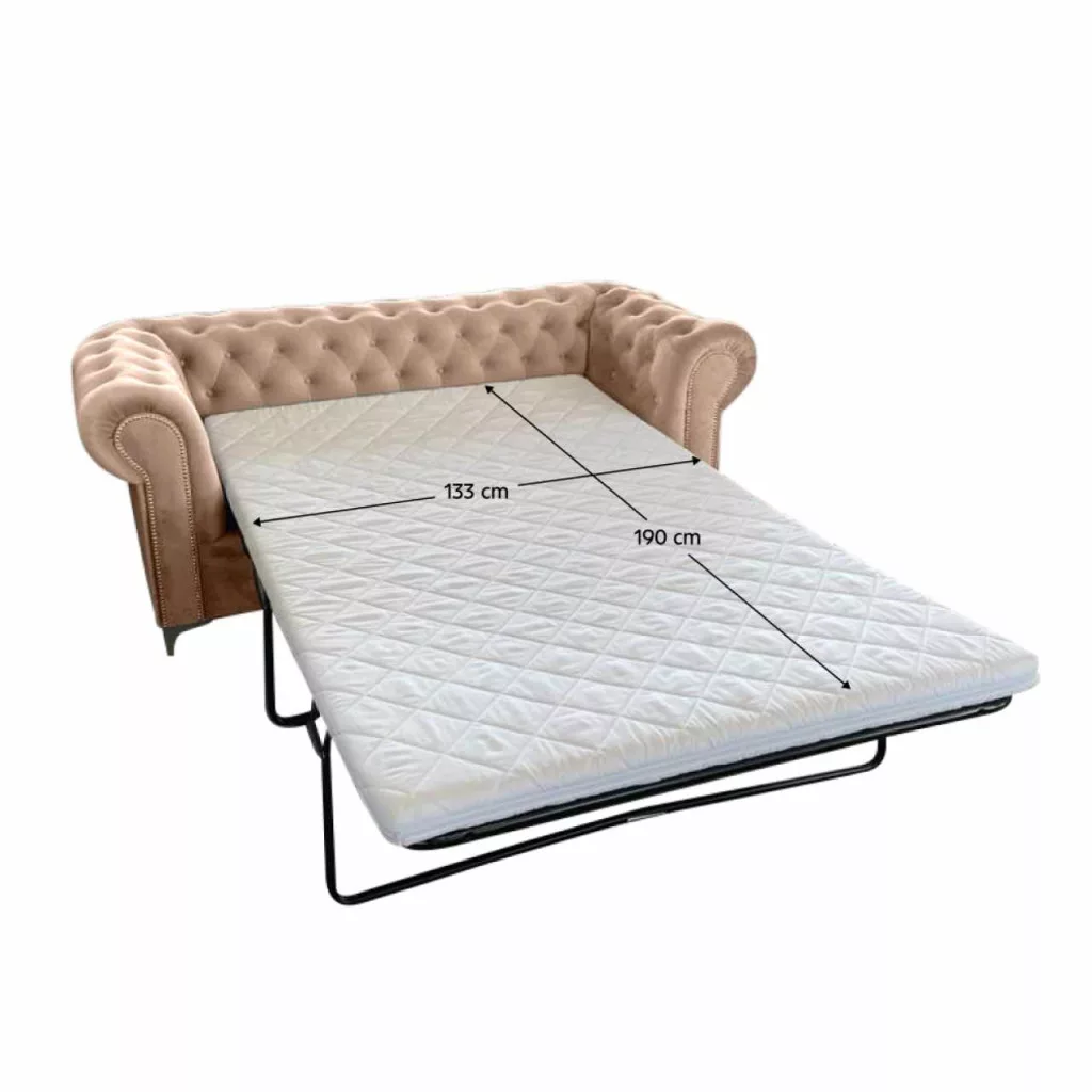 Kárpit anyaga: szövet Velvet 28A szövet kopásállósága a Martindale teszt szerint: 50 000 ciklusKárpit színe: világosbarnaMéretek (SzxMéxMa): 215x88x73 cmAlvófelület (SzxHo): 133x190 cmÜlés magassága: 46,6 cmÜlés mélysége: 55 cmFém lábakonLábak színe: ezüstAz alsó tér magassága a padlótól: 9 cmTeherbírás/személy: 120 kgTöltet: falista rugó Keménysége: T30Teljesen kárpitozottÍzlésesLuxusChesterfieldSteppeltKinyithatóDekoratív gombokDekoratív gombok színe: ezüstHárom párnával szállítvaAz ülőrész tépőzárral van ellátvaSzétszerelve szállítvaMegrendelhető a Velvet szövet 5 színárnyalatában 8-10 hét szállítási idővel. Egyedi megrendelés esetén az összeg 20%-át előlegként szükséges befizetni. Az előleg befizetése után a megrendelése gyártásba kerül.