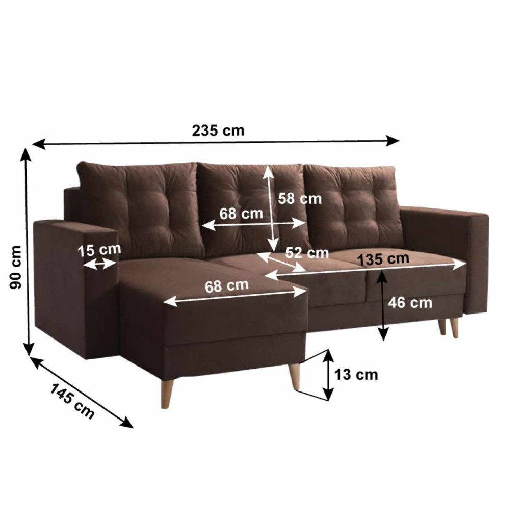 Kárpit anyaga: szövet Kronos 6A szövet kopásállósága a Martindale teszt szerint: 50 000 ciklusKárpit színe: barnaMéretek (SzxMéxMa): 235x145x90 cmAlvófelület (SzxHo): 130x200 cmÜlés magassága: 46 cmÜlés mélysége: 52 cmOttomán szélessége: 68 cmÜlőrész szélessége: 135 cmKarfa szélessége: 15 cmAz alsó tér magassága a padlótól: 13 cmFa lábakonLábak színe: tölgyTeherbírás/személy: 90 kgTöltet: falista rugó + poliuretán habHárom párnával szállítvaPárnák méretei (SzxMa): 68x58 cmKihúzhatóSarokTeljesen kárpitozottTárhellyelBalos kivitelezésSzétszerelve szállítva