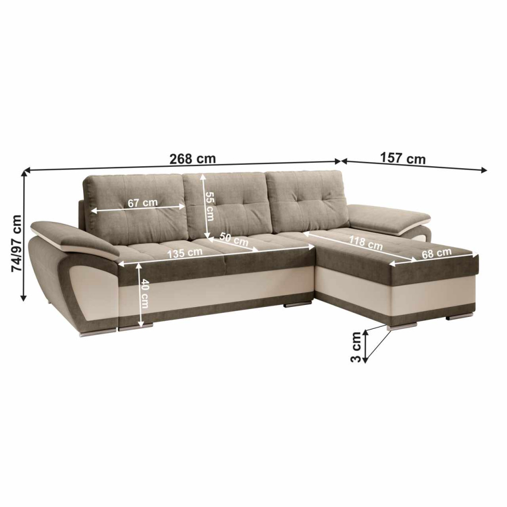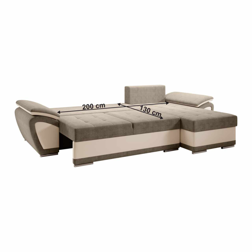Anyag: ekobőr 112/szövet Orinoco 24Az ekobőr kopásállósága a Martindale teszt szerint: 100 000 ciklusA szövet kopásállósága a Martindale teszt szerint: 72 000 ciklusSzín: bézs/világosbarnaMéretek (SzxMéxMa): 268x157x97 cmÜlés magassága: 40 cmÜlés mélysége: 50 cmAz alsó tér magassága a padlótól: 3 cmKinyithatóAlvófelület (SzxHo): 130x200 cmHáttámla magassága: 50 cmOttomán méretei (SzéxMé): 68x118 cmKarfa (SzéxMé): 31x90 cm Teherbírás/személy: 90 kgSarokTárhellyelDekoratív steppelésTöltet: Falista rugó/pur habMűanyag lábakonLábak színe: ezüstTeljesen kárpitozottJobbos kivitelezésHárom párnával szállítvaPárnák méretei (SzéxMé): 67x55 cmSzétszerelve szállítva