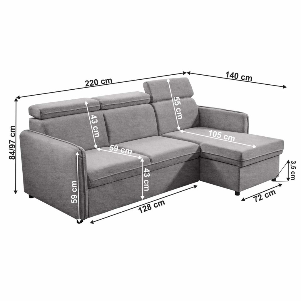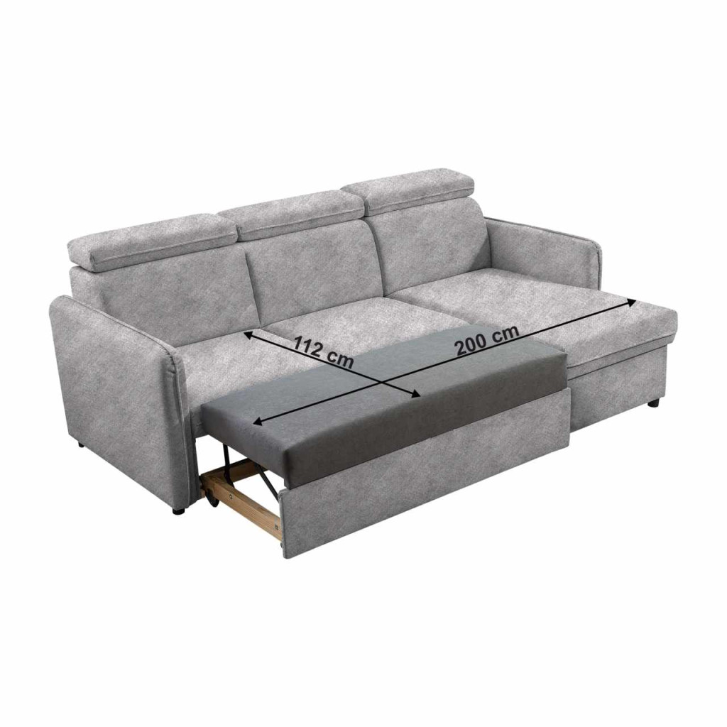 Kárpit anyaga: szövet Enjoy 21A szövet kopásállósága a Martindale teszt szerint: 45 000Kárpit színe: világosszürkeMéretek (SzxMéxMa): 220x140x84/97 cmAlvófelület (SzxHo): 112x200 cmÜlés magassága: 43 cmÜlés mélysége: 59 cmHáttámla magassága: 55 cmOttomán szélessége: 72 cmOttomán mélysége: 105 cmÜlőrész szélessége: 128 cmKarfák méretei (SzxMéxMa): 10x93x59 cmAz alsó tér magassága a padlótól: 3,5 cmMűanyag lábakLábak színe: feketeTeherbírás/személy: 90 kgTöltet: Falista rugóKinyithatóSarokTeljesen kárpitozottUniverzálisTárhellyelÁllítható fejtámlákSzétszerelve szállítvaMegrendelhető az Enjoy szövet 4 színváltozatában 6-8 hét szállítási idővel. Egyedi megrendelés esetén az összeg 20%-át előlegként szükséges befizetni. Az előleg befizetése után a megrendelése gyártásba kerül.