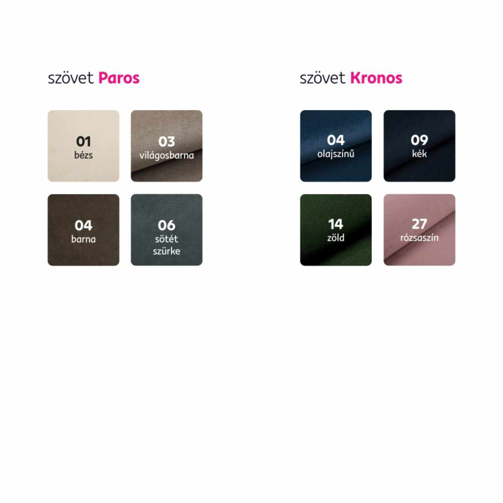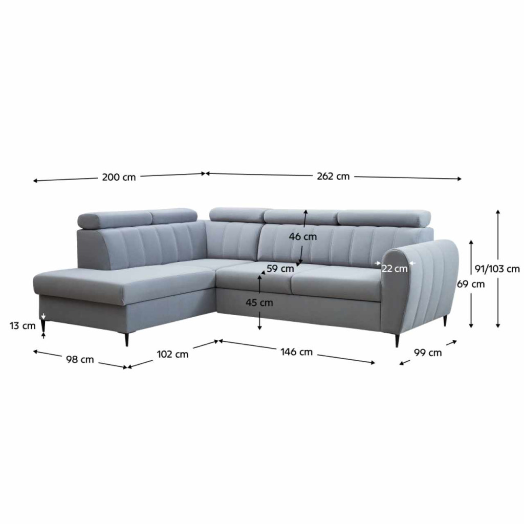 Kárpit anyaga: szövet Paros 05A szövet kopásállósága a Martindale teszt szerint: 50 000Kárpit színe: világosszürkeMéretek (SzxMéxMa): 262x200x91/103 cmAlvófelület (SzxHo): 128x210 cmÜlés magassága: 45 cmÜlés mélysége: 46/59 cmOttomán szélessége: 98 cmÜlőrész szélessége: 146 cmKarfák méretei (SzxMéxMa): 22x99x69 cmAz alsó tér magassága a padlótól: 10 cmLábakonLábak anyaga: fémLábak színe: feketeTeherbírás/személy: 90 kgTöltet: Falista rugó + Pur habKinyithatóSarokTeljesen kárpitozottBalos kivitelezésTárhellyelÁllítható fejtámlákSzétszerelve szállítvaMegrendelhető a Paros szövet 4 színárnyalatában és a Kronos szövet 4 színárnyalatban 6-8 hét szállítási idővel. Egyedi megrendelés esetén az összeg 20%-át előlegként szükséges befizetni. Az előleg befizetése után a megrendelése gyártásba kerül.