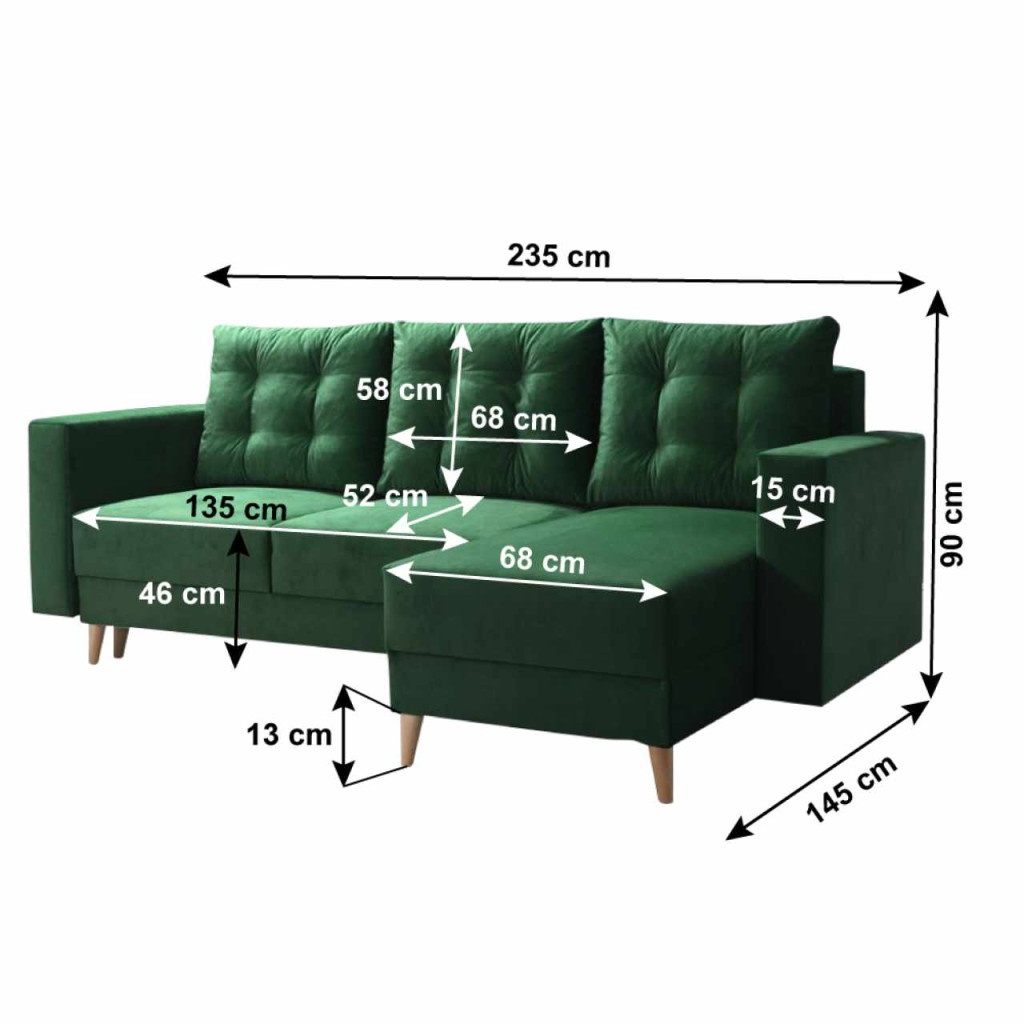 Kárpit anyaga: szövet Kronos 19A szövet kopásállósága a Martindale teszt szerint: 50 000 ciklusKárpit színe: zöldMéretek (SzxMéxMa): 235x145x90 cmAlvófelület (SzxHo): 130x200 cmÜlés magassága: 46 cmÜlés mélysége: 52 cmOttomán szélessége: 68 cmÜlőrész szélessége: 135 cmKarfa szélessége: 15 cmAz alsó tér magassága a padlótól: 13 cmFa lábakonLábak színe: tölgyTeherbírás/személy: 90 kgTöltet: falista rugó + poliuretán habHárom párnával szállítvaPárnák méretei (SzxMa): 68x58 cmKihúzhatóSarokTeljesen kárpitozottTárhellyelJobbos kivitelezésSzétszerelve szállítva