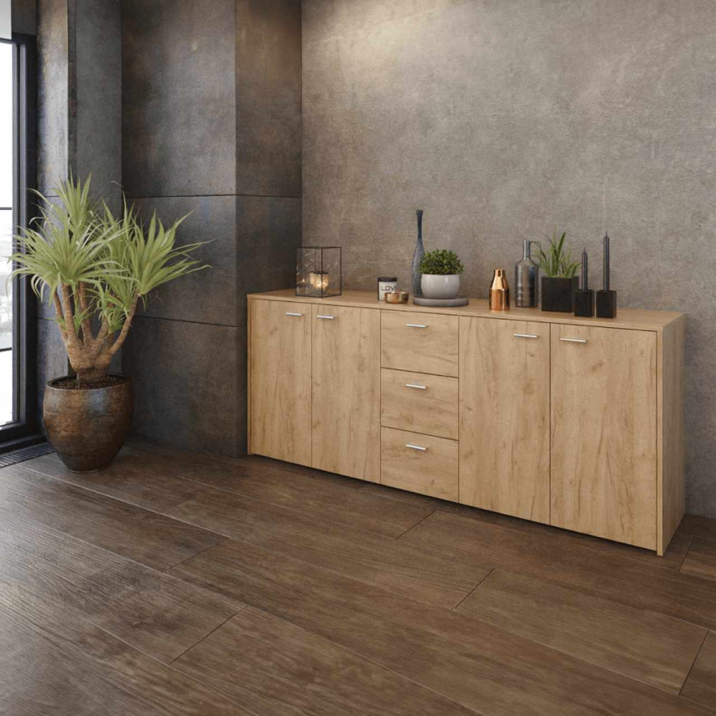 Anyag: laminált DTDSzín: artisan tölgyMéretek (SzxMéxMa): 180x42x74,5 cmAnyag vastagsága: 1,6 cmPolcosNégyajtósHárom fiókMűanyag fogantyúkkalFogantyúk színe: ezüstFelső polc teherbírása: 10 kgBelső polcok teherbírása: 5 kgFiókok teherbírása: 5 kgMűanyag siklókJavasoljuk a falhoz rögzíteniMinőségi szlovák termékSzétszerelve szállítva