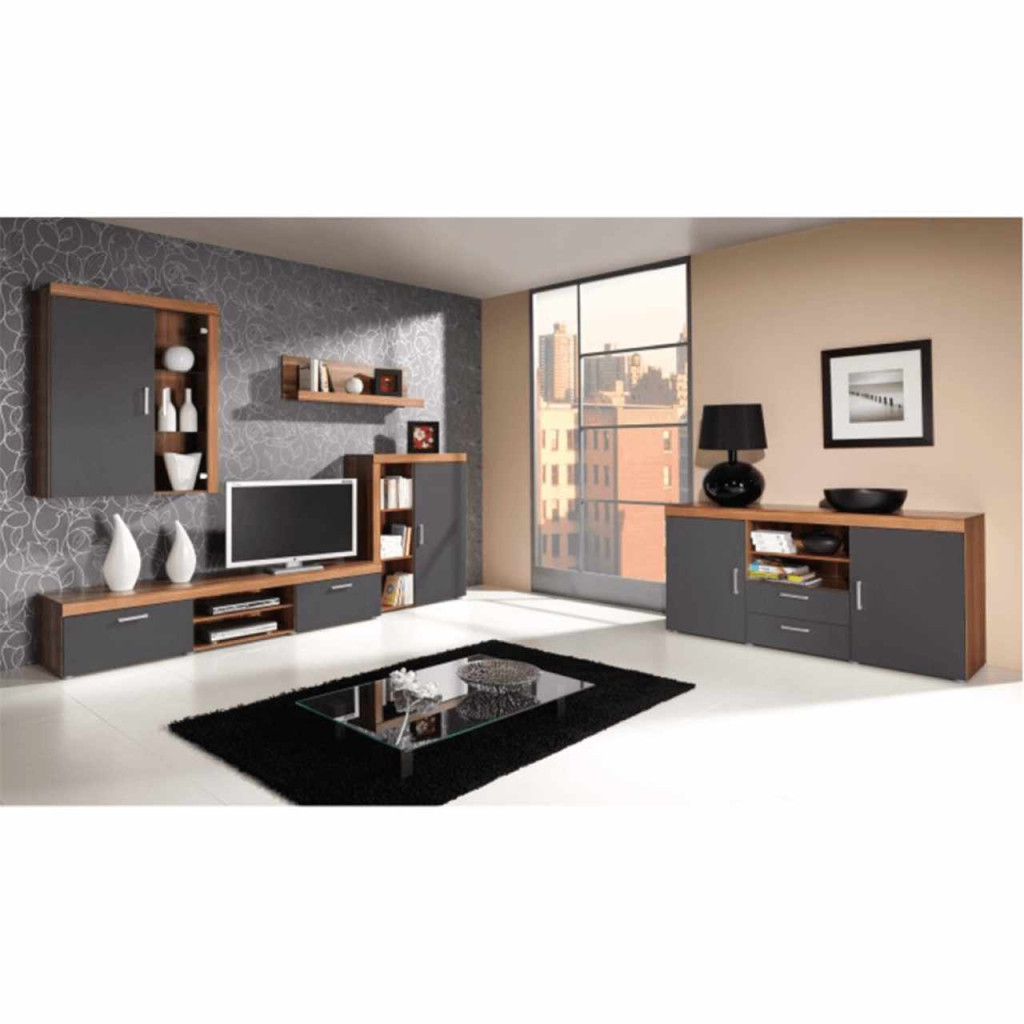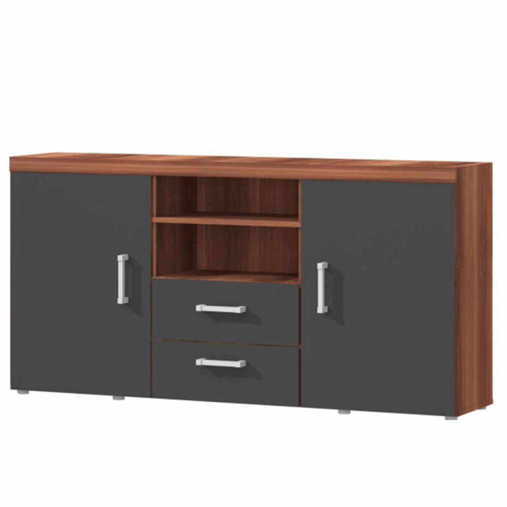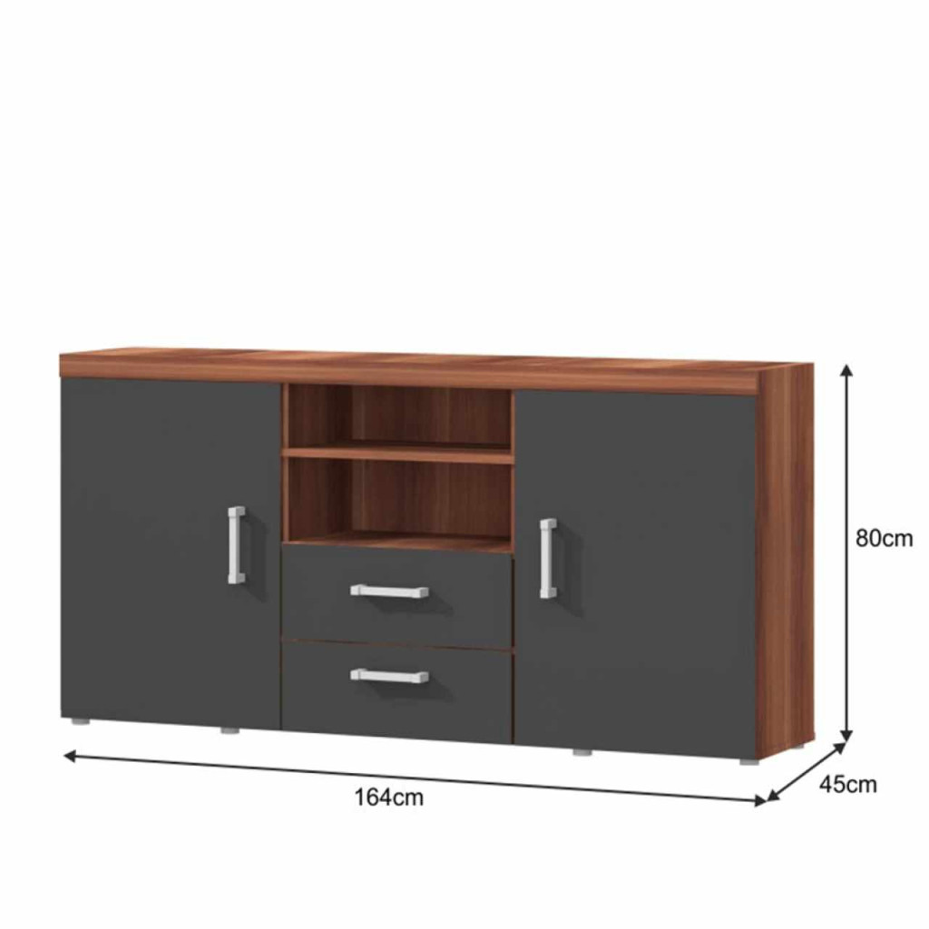 Anyag: laminált DTD Szín: szilva/szürke grafit Méretek (SzéxMéxMa): 164x45x80 cm 2 szekrény Nyitott tároló 2 fiók Szétszerelve szállítva