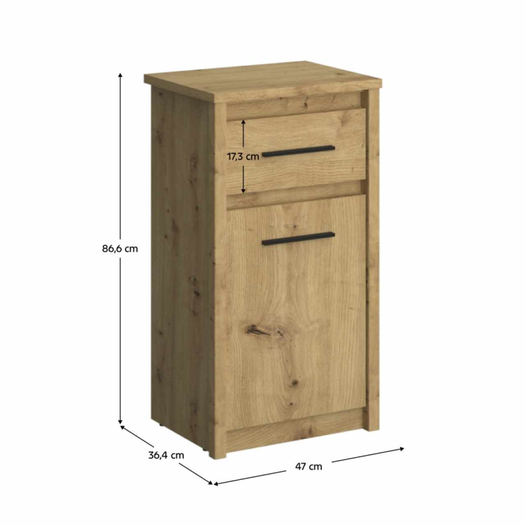 Anyag: laminált DTD/ABS élekSzín: artisan tölgyMéretek (SzxMéxMa): 47x36,4x86,6 cmAnyag vastagsága: 1,6-3,2 cmMűanyag fogantyúkFogantyúk színe: feketeFiókFiók teherbírása: 3 kgFiók magassága: 17,3 cmPolcPolcok teherbírása: 5 kgEgyajtós szekrényMűanyag lábakModern dizájnSzétszerelve szállítva