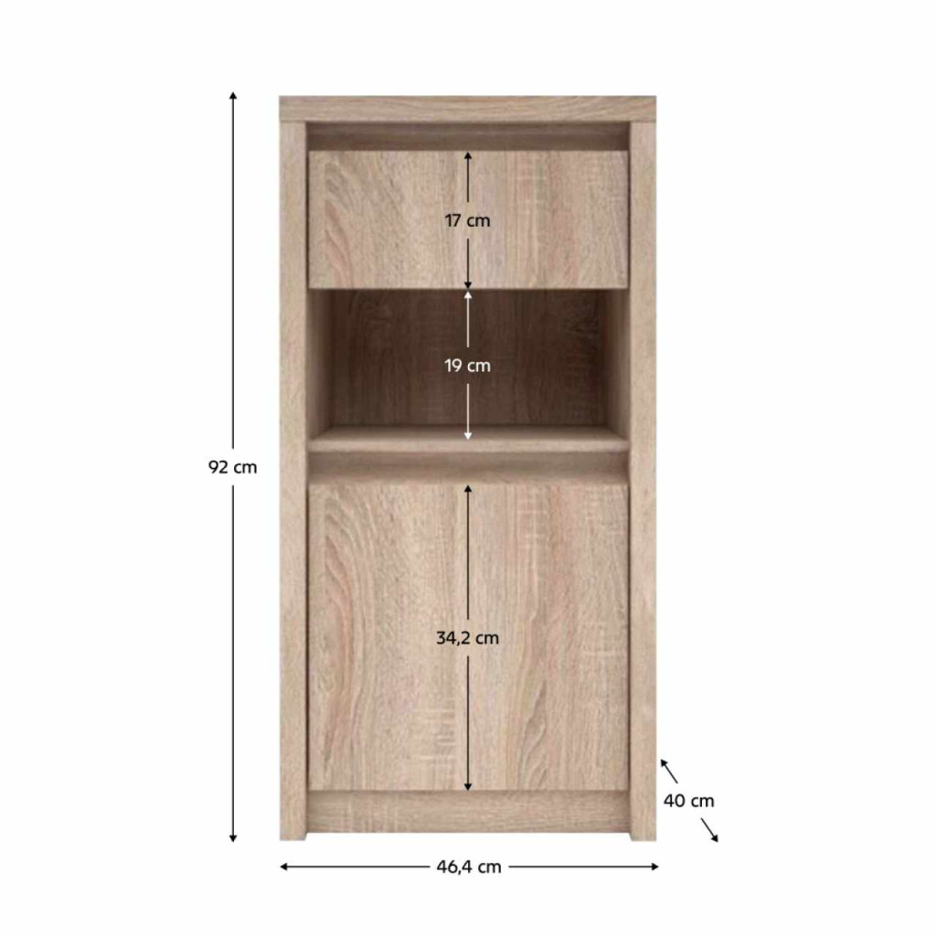 Anyag: laminált DTDSzín: sonoma tölgyMéretek (SzxMéxMa): 46,4x40x92 cmAnyag vastagsága: 3,2 cmTöbbi rész anyagvastagsága: 1,6 cmFiókFiók magassága: 17 cmNyitott tárhelyNyitott tárhely magassága: 19 cmEgyajtós szekrénySzekrény magassága: 34,2 cmAjánljuk a falhoz rögzíteniSzétszerelve szállítva