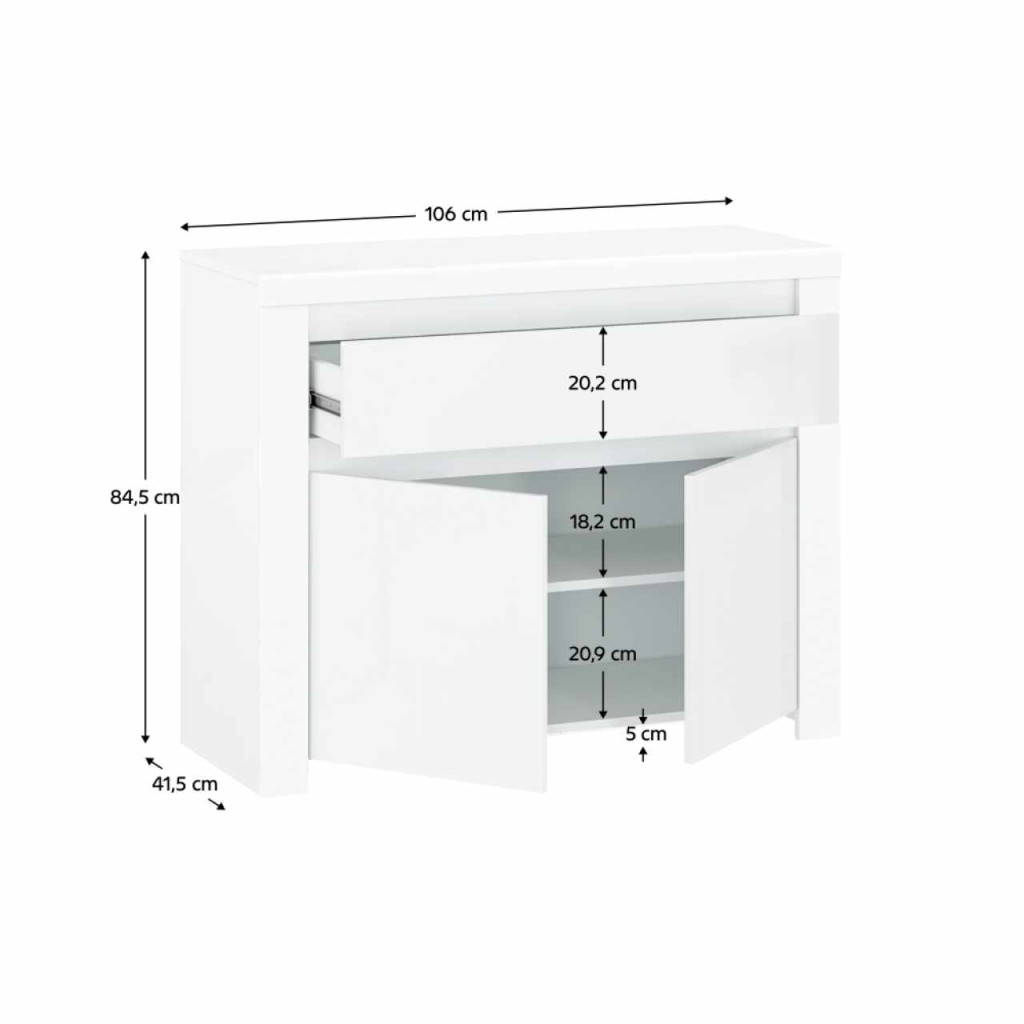 Anyag: laminált DTD/MDF/ABS élek Szín: fehér fényes Méretek (SzxMéxMa): 106x41,5x84,5 cm Anyag vastagsága: 1,6 cm Tartalmaz egy fiókot és szekrényt 1 polc Az ajtók nem rendelkeznek fogantyúval Korpusz DTD-ből ajtók/elülső részek MDF-ből ABS élek Modern dizájn Bontásban szállítva