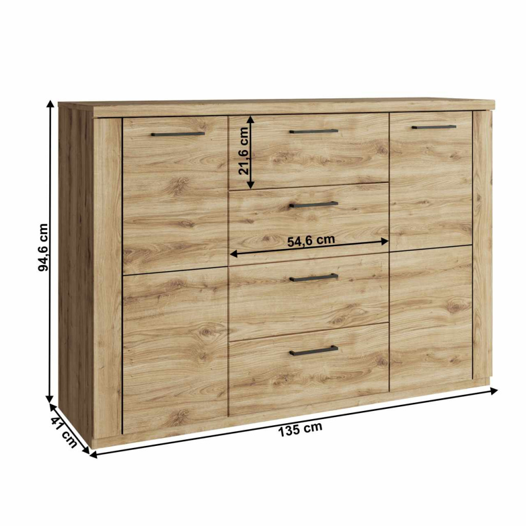 "Komód DORSI 2D4S Anyag: laminált DTD/MDF Szín: navarra tölgy Méretek (SzxMéxMa): 135x41x 94,6 cm Anyag vastagsága: 1,6 cm Kétajtós Polcos Négy fiók Fiók méretei (SzxMa): 54,6x21,6 cm Műanyag fogantyúk Fogantyúk színe: fekete Modern dizájn
