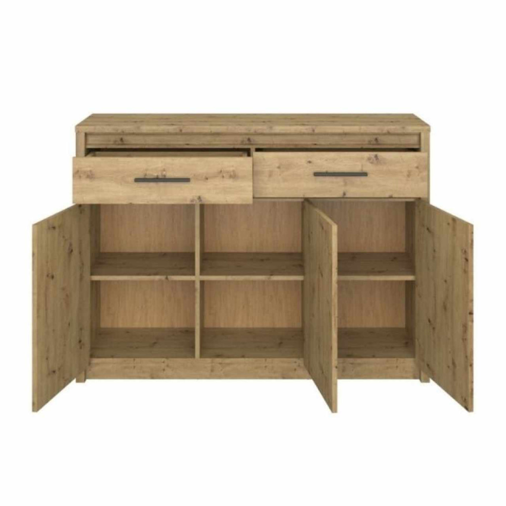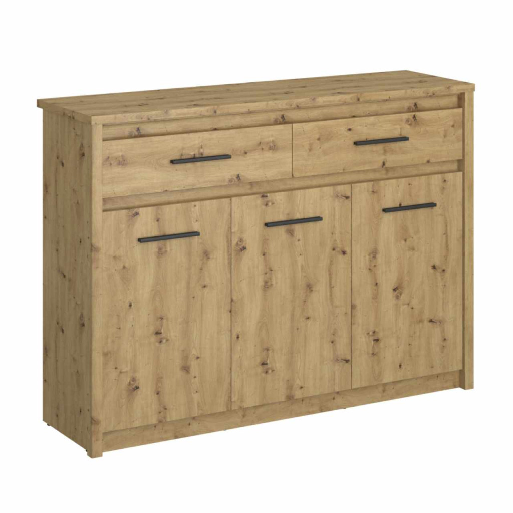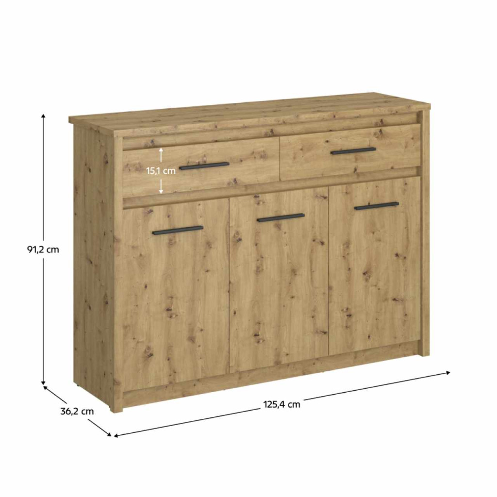 Anyag: laminált DTD/ABS élekSzín: artisan tölgyMéretek (SzxMéxMa): 125,4x36,2x91,2 cmAnyag vastagsága: 1,6-3,2 cmMűanyag fogantyúkFogantyúk színe: feketeHáromajtósKét fiókFiók teherbírása: 5 kgFiók magassága: 15,1 cmMűanyag lábakModern dizájnAjánljuk a falhoz rögzíteniSzétszerelve szállítva