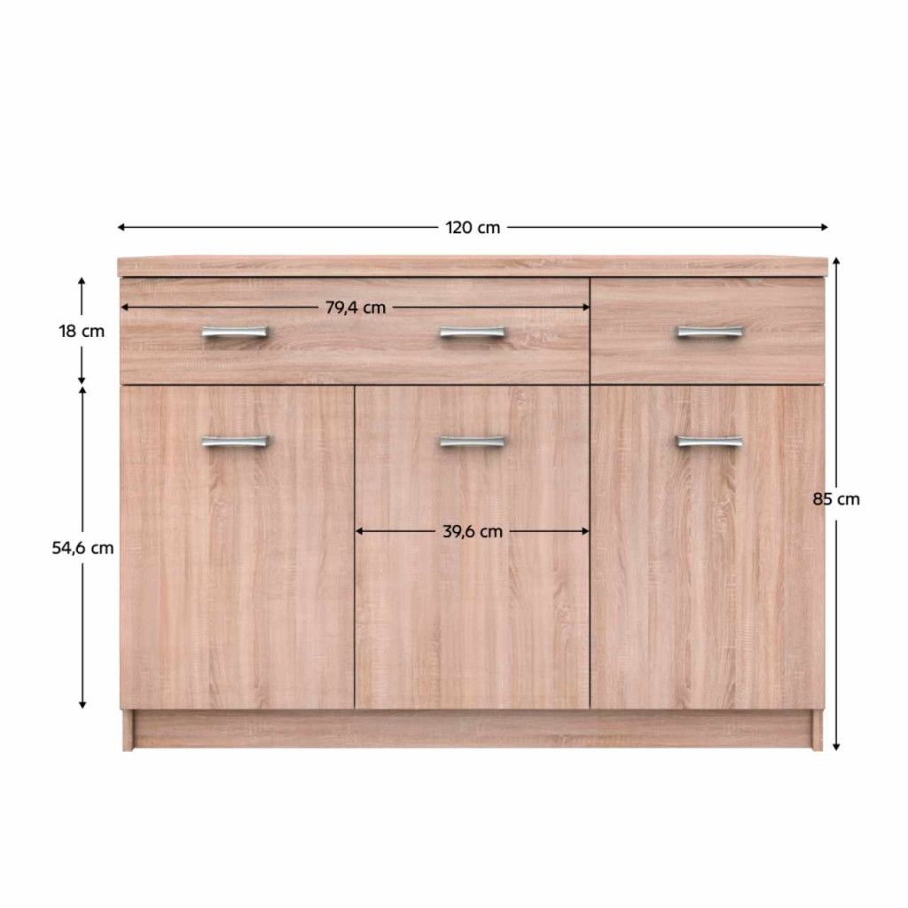 Komód 3D2S TOPTY TYP 23Anyag: laminált DTDKivitelezés: sonoma tölgyMéretek (SzxMéxMa): 120x33x85 cmAjtók méretei (SzéxMa): 39,6x54,6 cmHáromajtósKét fiókPolcosIrodák, dolgozószobák, lakóterek vagy előszobák berendezésére alkalmas modern elemes rendszer
