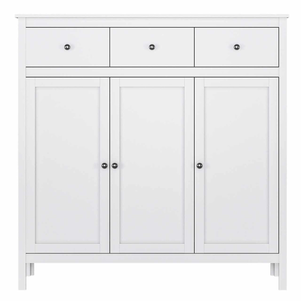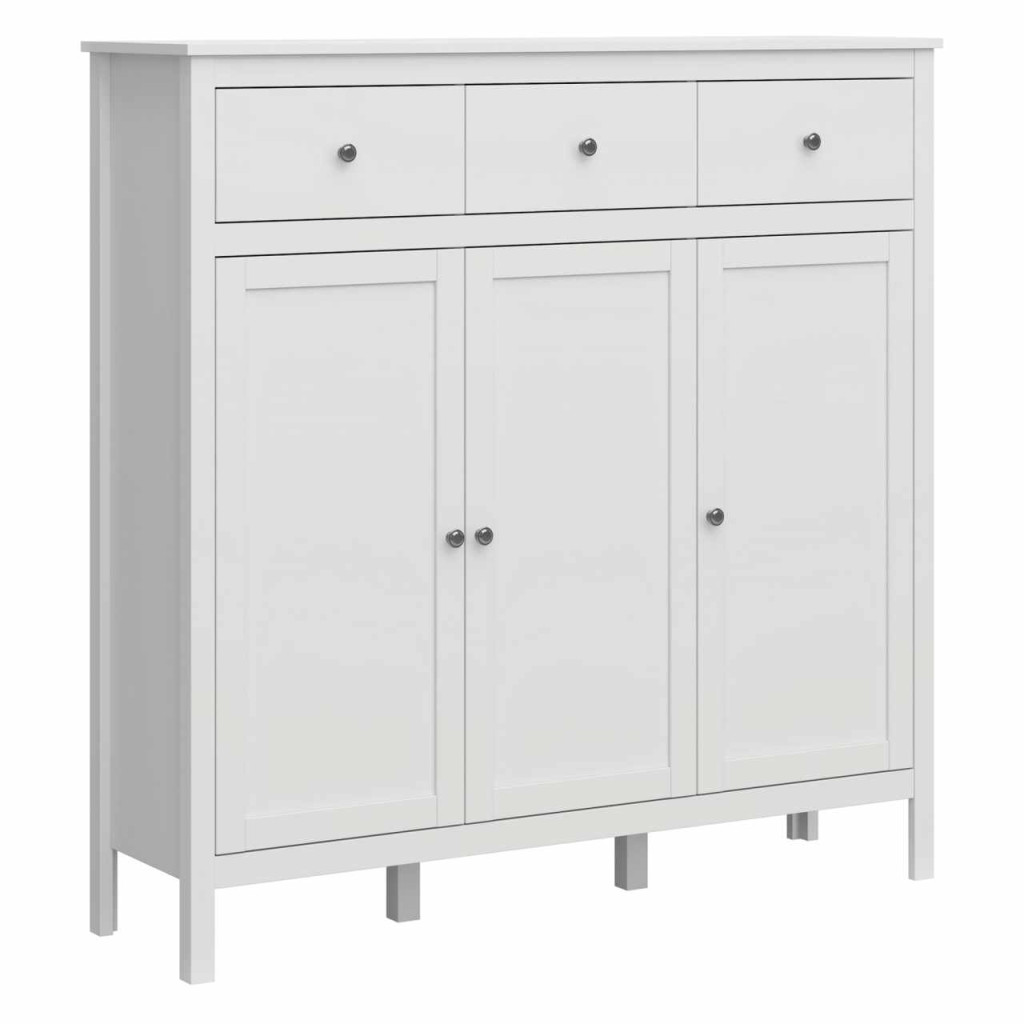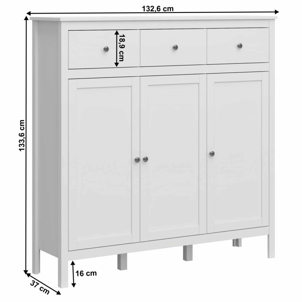"Anyag: laminált DTD/ABS élek/MDF Szín: fehér Méretek (SzxMéxMa): 132,6x37x133,6 cm Lábak magassága: 16 cm Anyag vastagsága: 1,6 cm Kombinált Három fiók Fiók magassága: 18,9 cm Három szekrény A szekrényben polcok vannak MDF ajtók Szétszerelve szállítva "