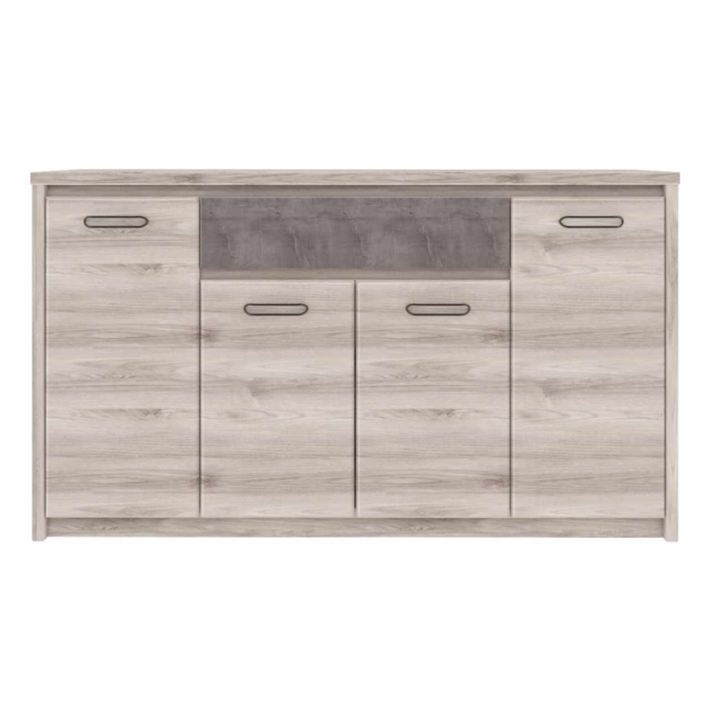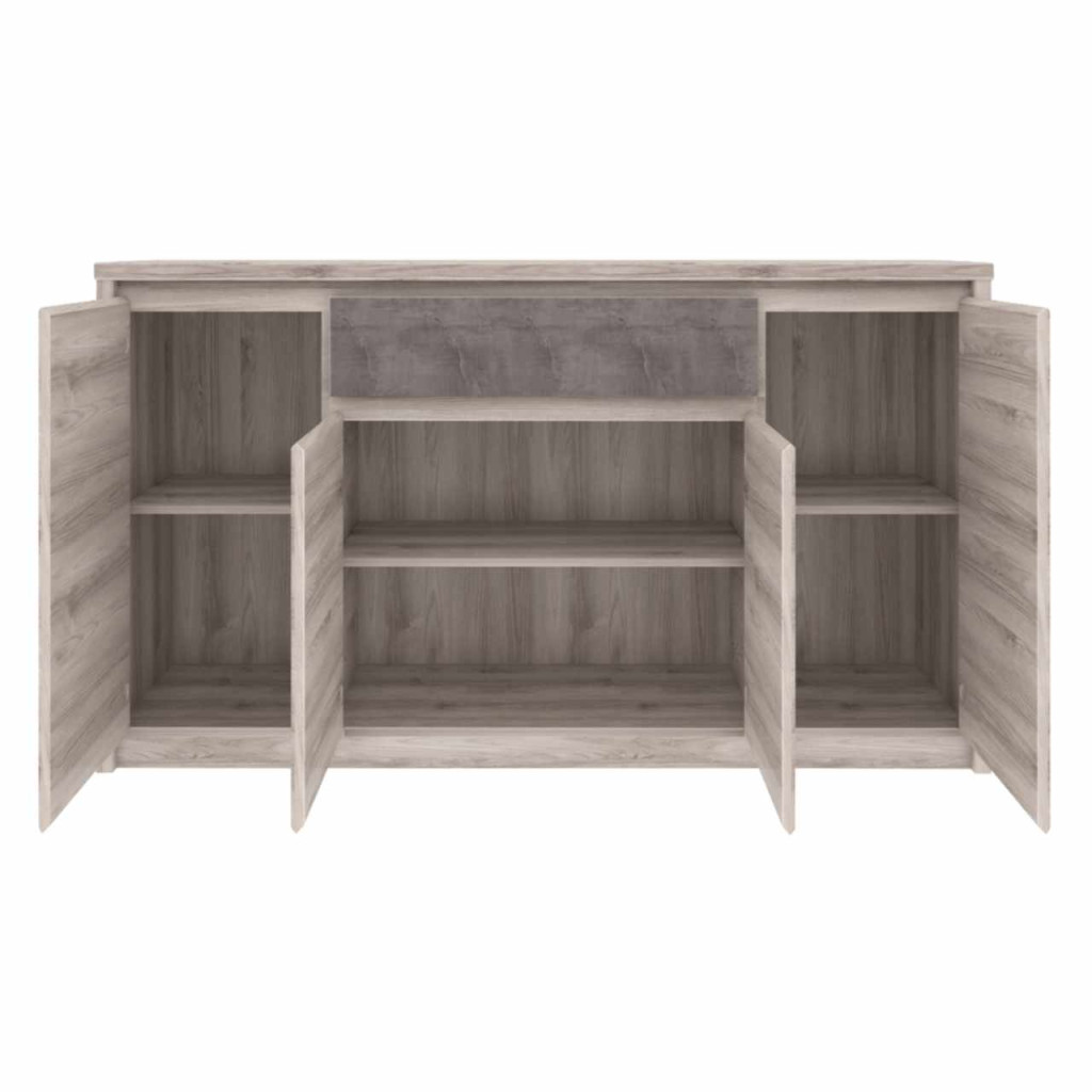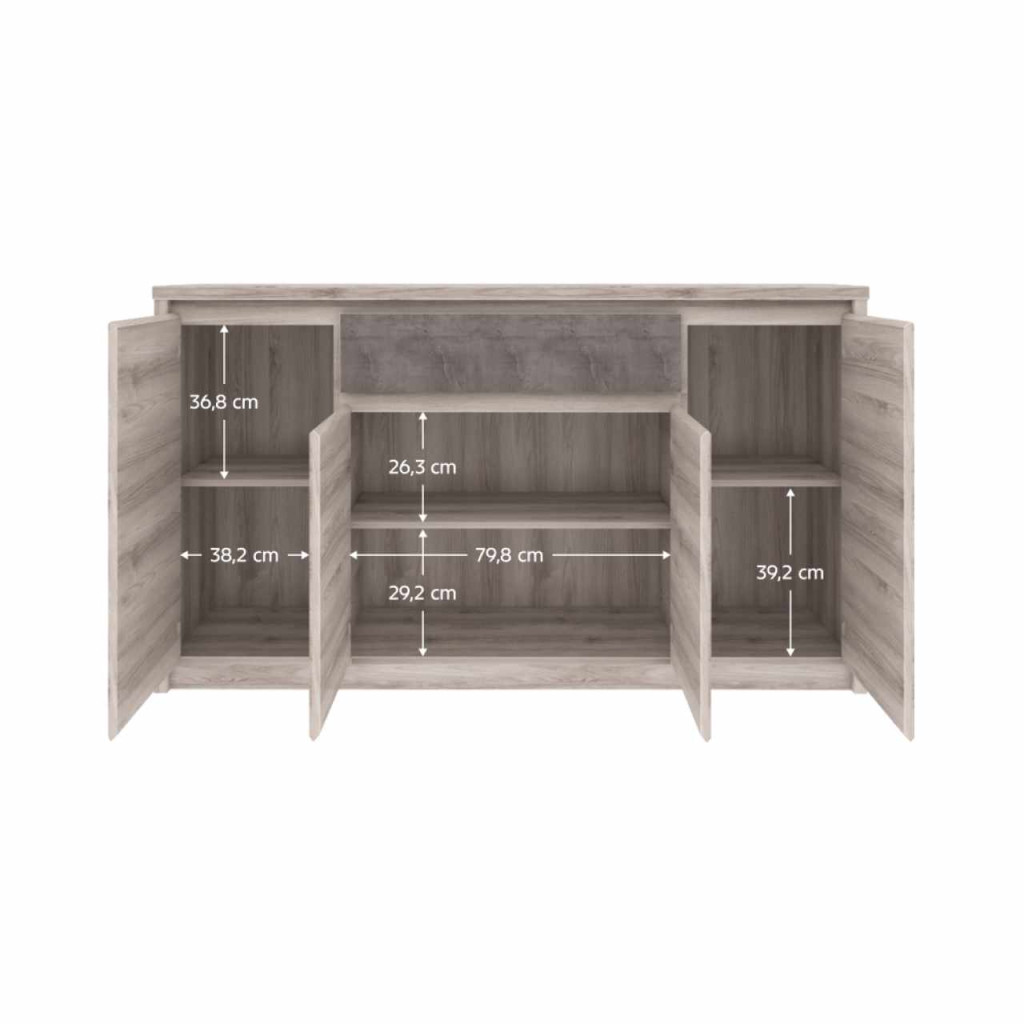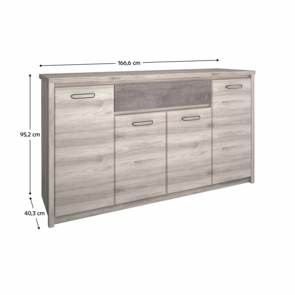 Anyag: laminált DTDSzín: nairobi gesztenye/onixMéretek (SzxMéxMa): 166,6x95,2x40,3 cmAnyag vastagsága: 1,6-3,2 cmMűanyag lábakFém fogantyúkFogantyúk színe: feketeNégyajtósPolcokFiókFiók teherbírása: 5 kgModern dizájnSzétszerelve szállítva