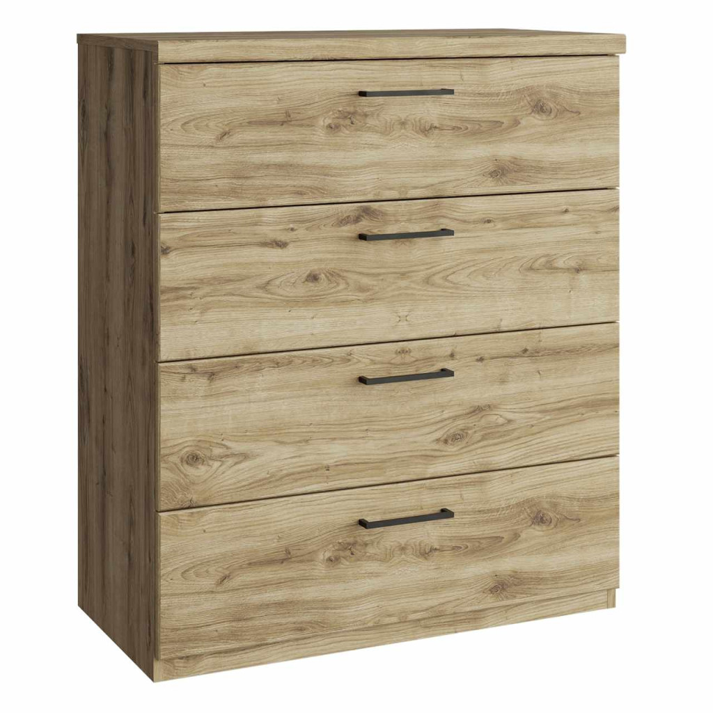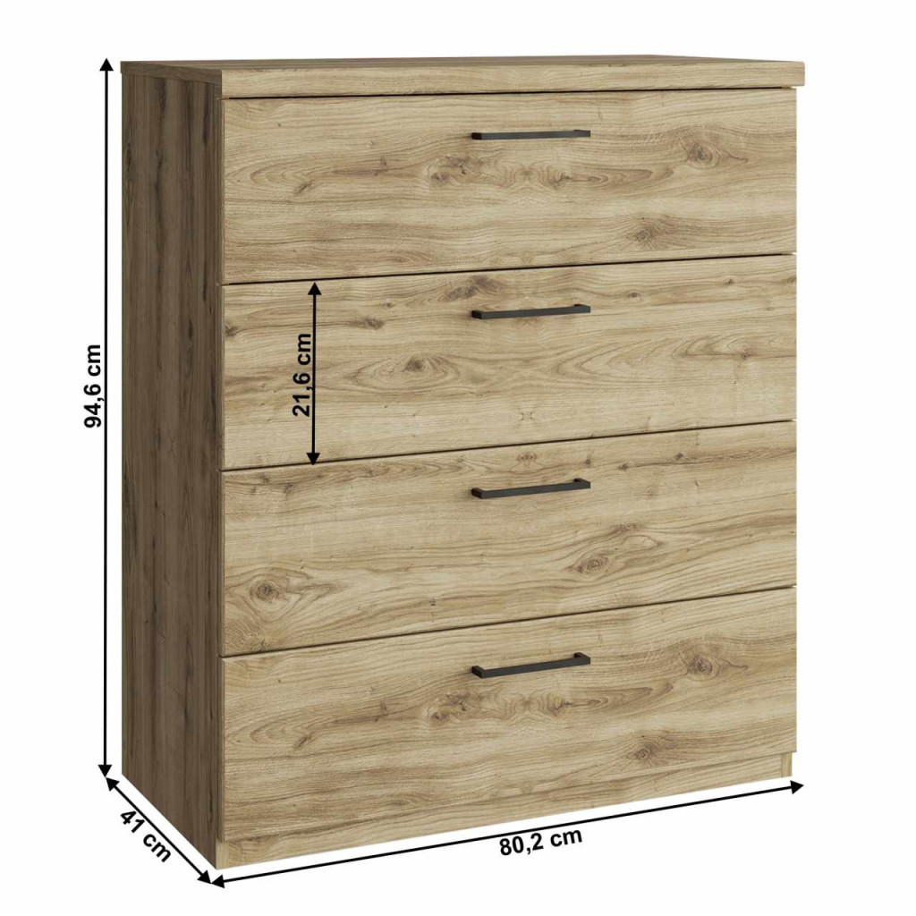 "Komód DORSI 4S Anyag: laminált DTD/MDF Szín: navarra tölgy Méretek (SzxMéxMa): 80,2x41x94,6 cm Anyag vastagsága: 1,6 cm Négy fiók Fiókok magassága: 21,6 cm Műanyag fogantyúk Fogantyúk színe: fekete Modern dizájn