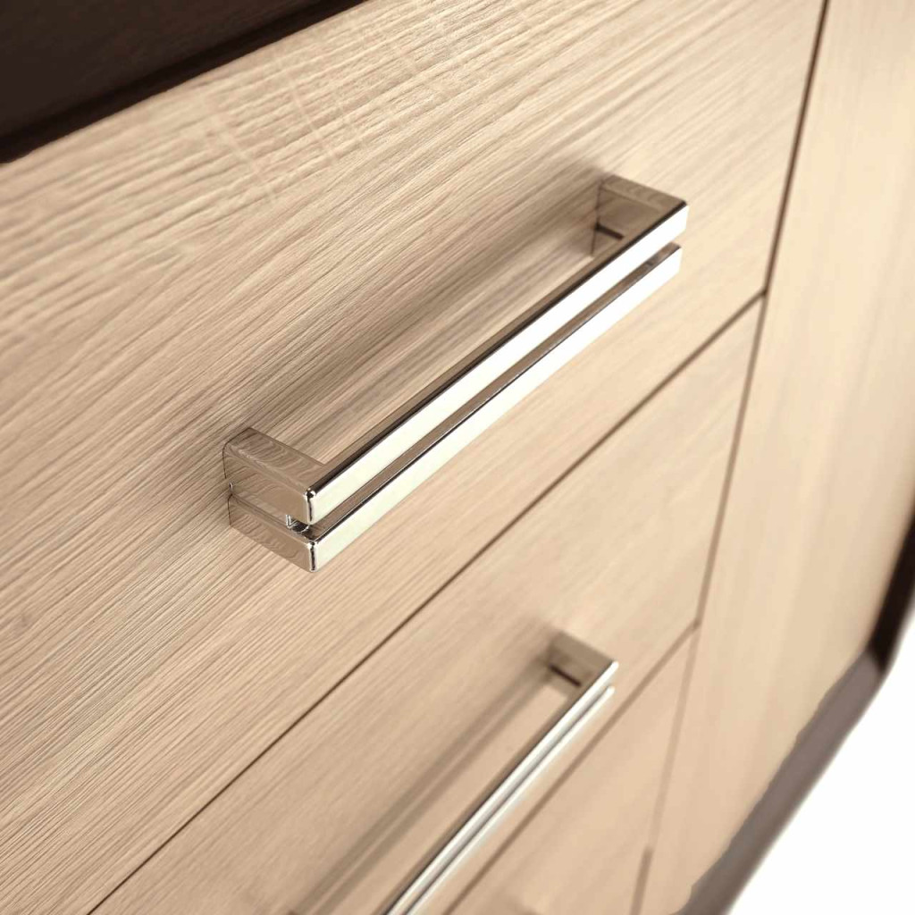 Komód a Korina nappali bútorhoz, Anyag: laminált DTD, a lécek MDF-ből készültek, Színváltozat: tölgy sötét + tölgy világos, ezüst színű fogantyúk; Komód mérete (SzéxMéxMa): 140x48x100cm.