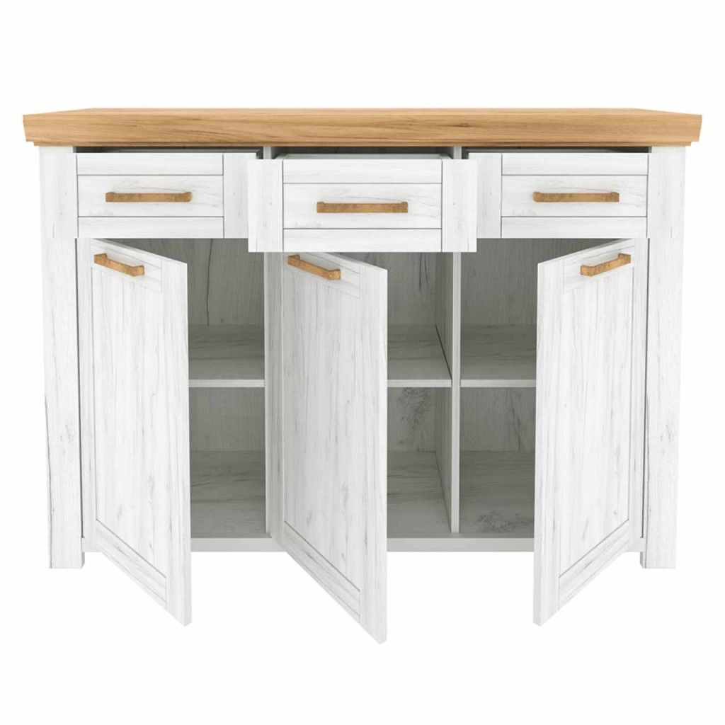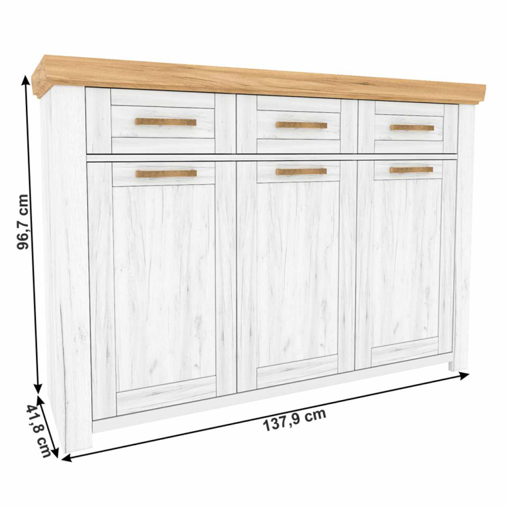 Anyag: DTD laminált/MDF laminált Szín: tölgy craft arany/tölgy craft fehér Méretei (SzéxMéxMa): 137,9x41,8x96,7 cm Korpusz anyag vastagsága: 16 mm Felső lap anyag vastagsága: 22 mm Ajtók anyag vastagsága: 19 mm Alsó terület magassága a padlótól 4,2 cm Három fiók Három szekrény Bontásban szállítva.