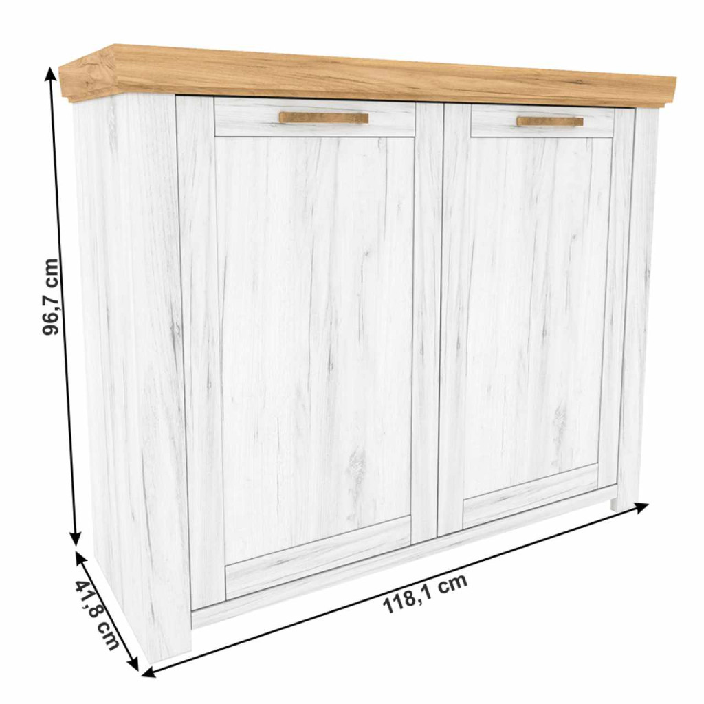 Anyag: DTD laminált/MDF laminált Szín: tölgy craft arany/tölgy craft fehér Méretei (SzéxMéxMa): 118,1x41,8x96,7 cm Korpusz anyag vastagsága: 16 mm Felső lap anyag vastagsága: 22 mm Ajtók anyag vastagsága: 19 mm Alsó terület magassága a padlótól 4,2 cm Két szekrény Bontásban szállítva.