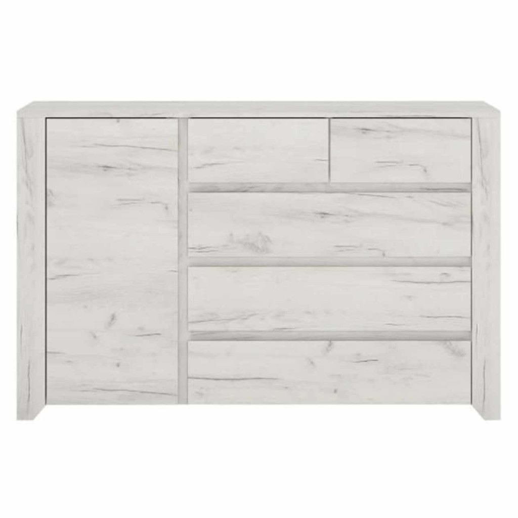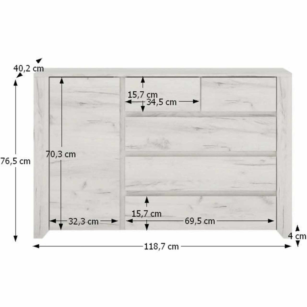 Komód ANGEL 41, szekrénnyel, két kisebb és három nagyobb fiókkal Anyag: laminált DTD Színe: fehér craft Méretek (SzéxMéxMa): 118,7x40,2x76,5 cm Anyag vastagsága: 16 mm Az alsó tér magassága a padlótól: 2,5 cm Szállítás szétszerelve