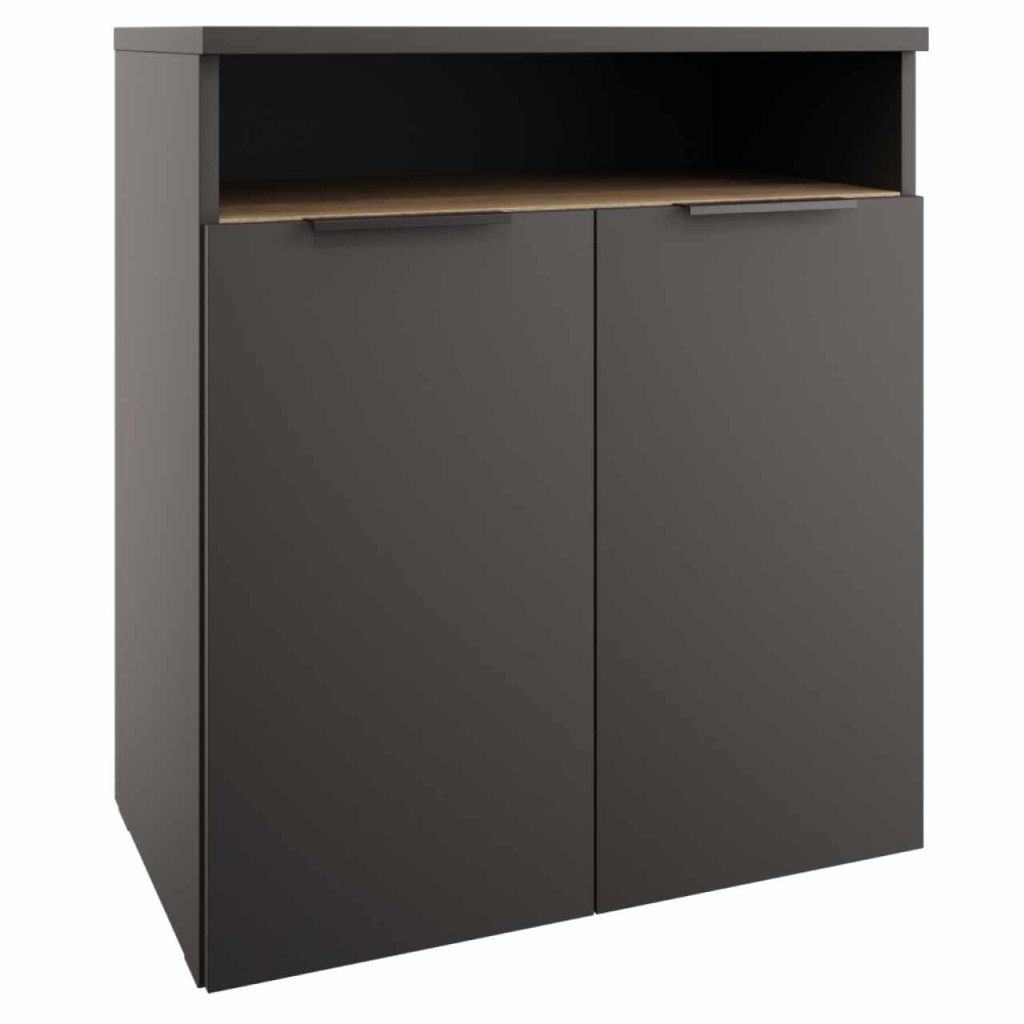 Anyag: laminált DTD/ABS élekSzín: antracit/cremona tölgyMéretek (SzxMéxMa): 67x40x75,5 cmAnyag vastagsága: 1,6-2,2 cmKétajtósEgy szekrényPolcosNyitott tárolóhelyFém fogantyúkFogantyúk színe: feketeMűanyag csúszkákMűanyag csúszkák magassága: 0,5 cmJavasoljuk a falhoz rögzíteniSzétszerelve szállítva