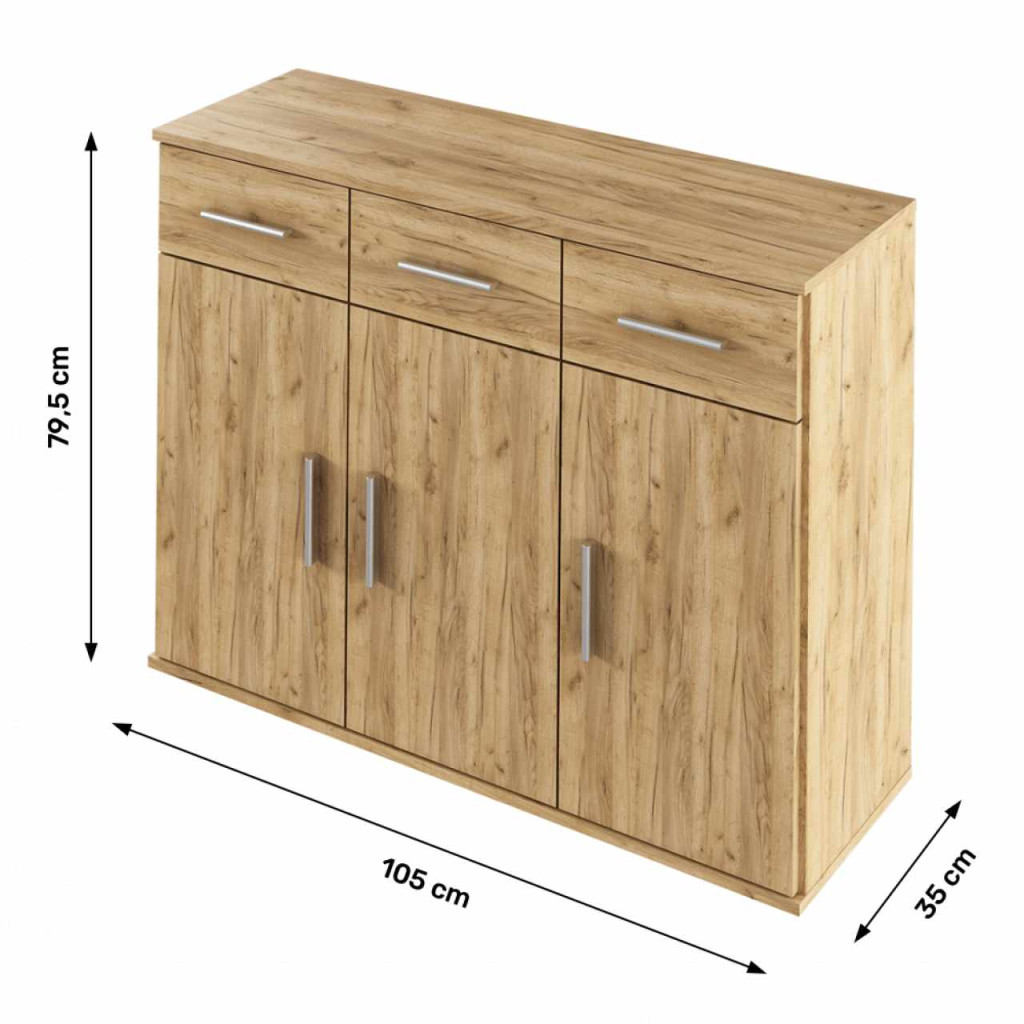 Anyag: laminált DTD Szín: tölgyfa artisan Méretek (SzxVxH): 105x35x79,5 cm Háromajtós Három kisszekrény Három fiók Fogantyúval Szétszerelve szállítva