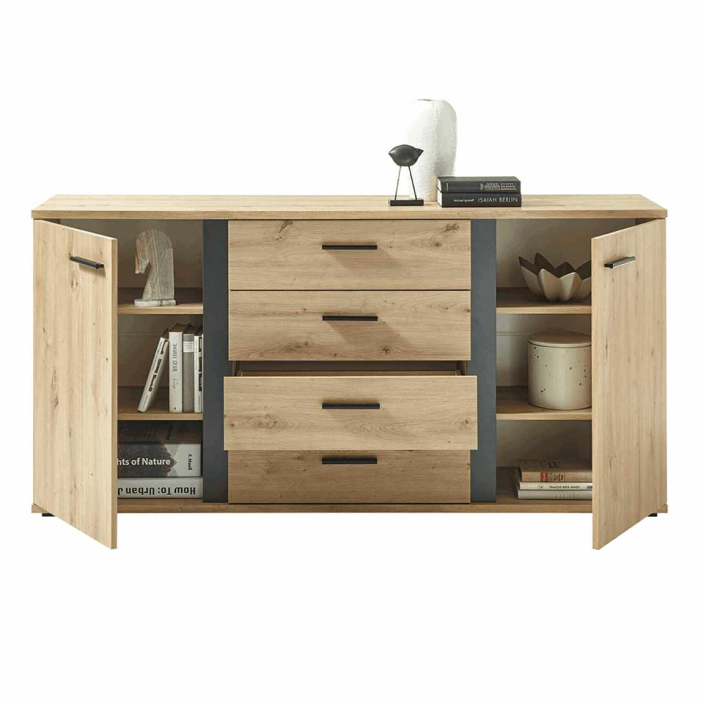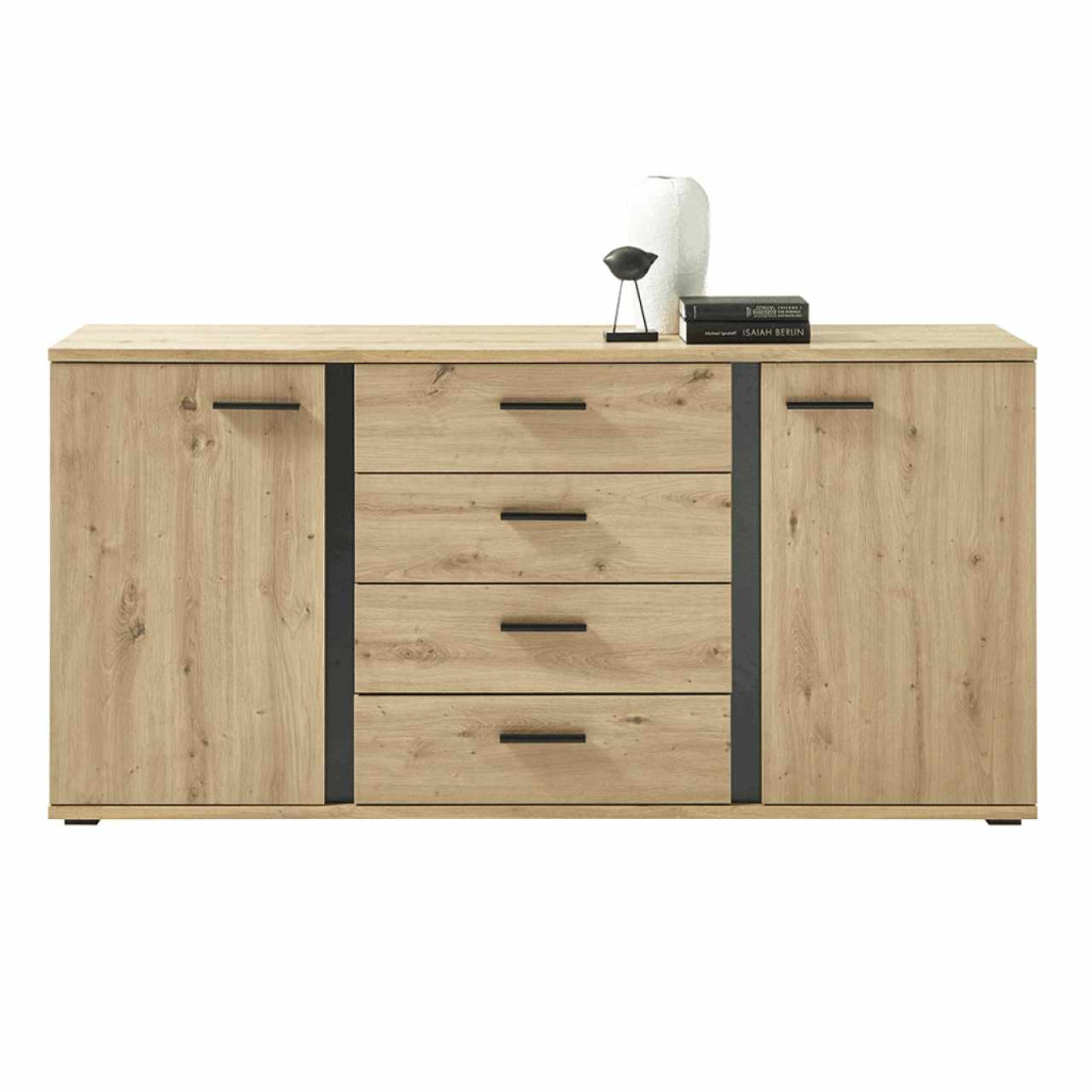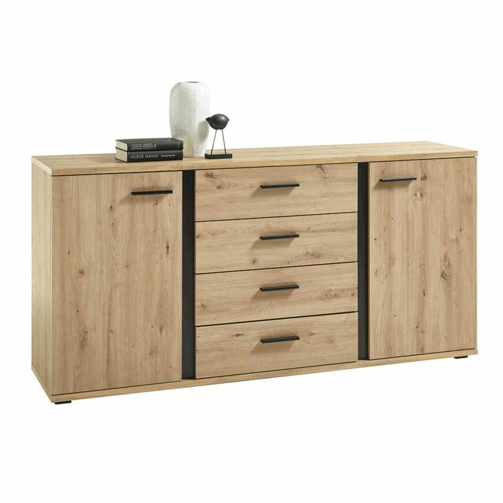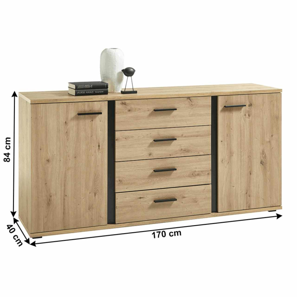 Komód KANODE Anyag: laminált faforgácslap Szín: artisan tölgy/fekete Méretek (SzéxMéxMa): 170x40x84 cm Anyagvastagság: 16 mm Tartalmaz két szekrényt és négy fiókot Fogantyúkkal Rengeteg tárhely és rakodóhely Rusztikus stílus Bontásban szállítva