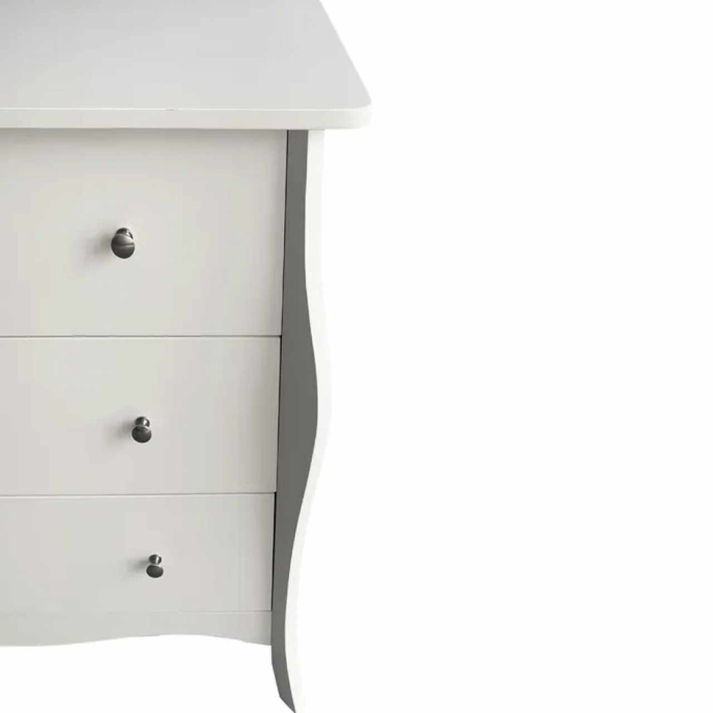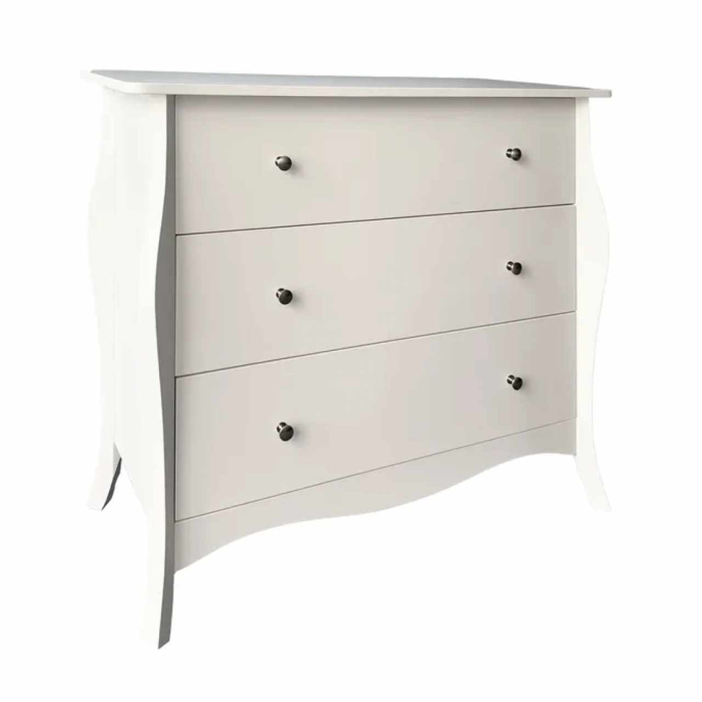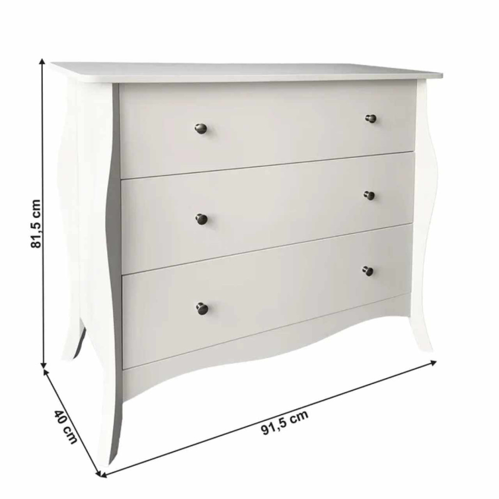 Anyag: MDF/fémSzín: fehérMéretek (SzxMéxMa): 91,5x40x81,5 cmTeherbírás: 30 kgFiókok teherbírása: 10 kgFém fogantyúkHárom fiókBarokk stílusAnyag vastagsága: 1,5 - 2,7 cmLábak magassága: 13 cmJavasoljuk a falhoz rögzíteniSzétszerelve szállítva