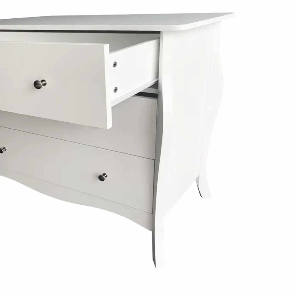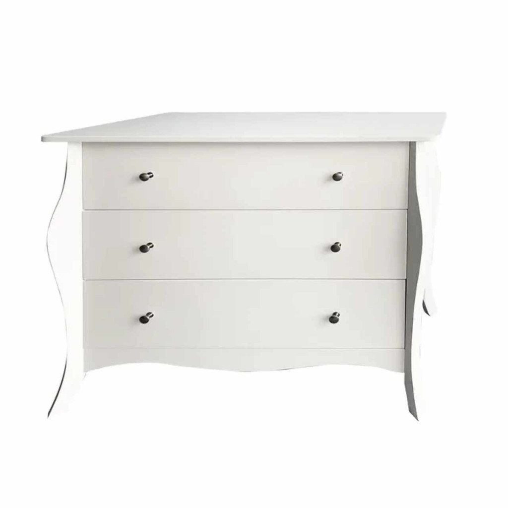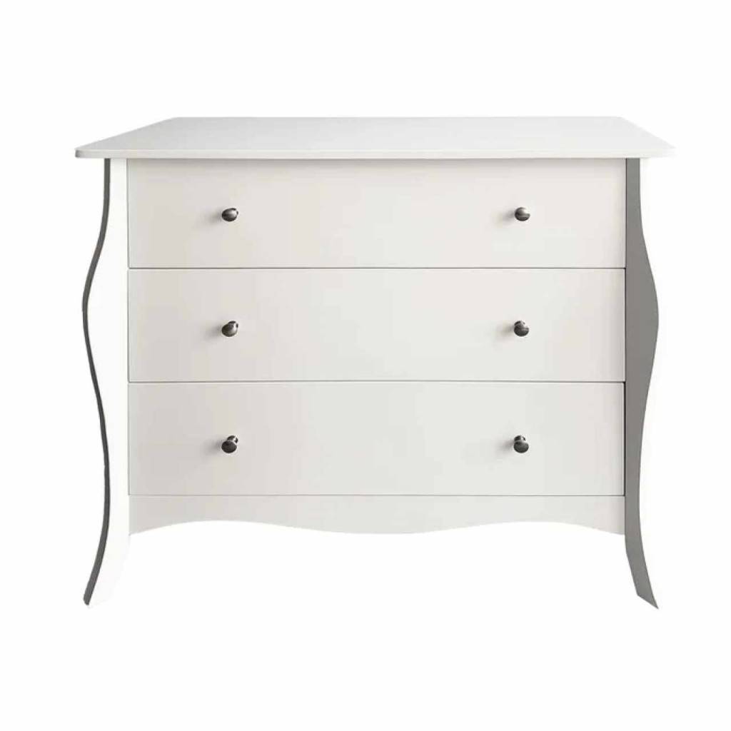 Anyag: MDF/fémSzín: fehérMéretek (SzxMéxMa): 91,5x40x81,5 cmTeherbírás: 30 kgFiókok teherbírása: 10 kgFém fogantyúkHárom fiókBarokk stílusAnyag vastagsága: 1,5 - 2,7 cmLábak magassága: 13 cmJavasoljuk a falhoz rögzíteniSzétszerelve szállítva