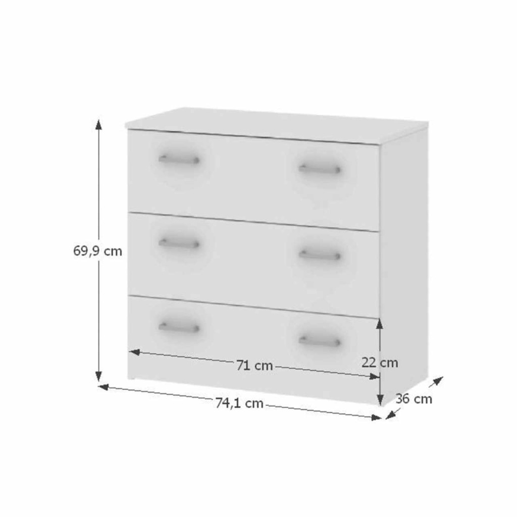 Komód GARBO 3 Anyag: laminált DTD Változat: fehér Komód méretei (SzéxMéxMa): 74,1x36x69,9 cm Fiók méretei (SzéxMa): 71x22 cm 3 fiók Szállítás szétszerelve.