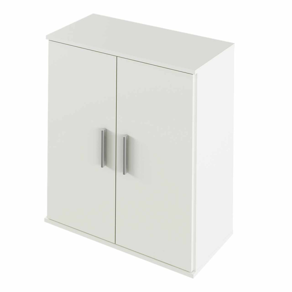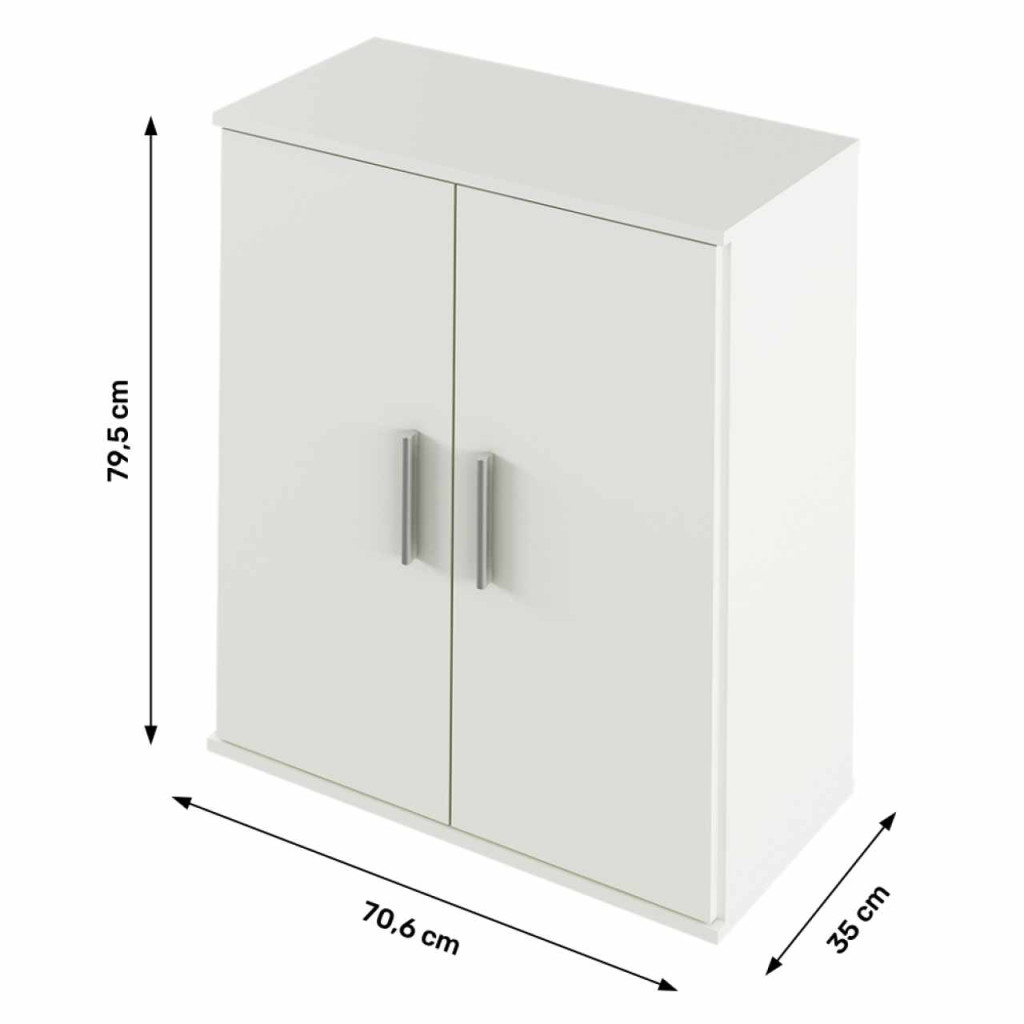 Anyag: laminált DTD Szín: fehér Méretek (SzxVxH): 70,6x35x79,5 cm Kétajtós Polcos Fogantyúval Szétszerelve szállítva
